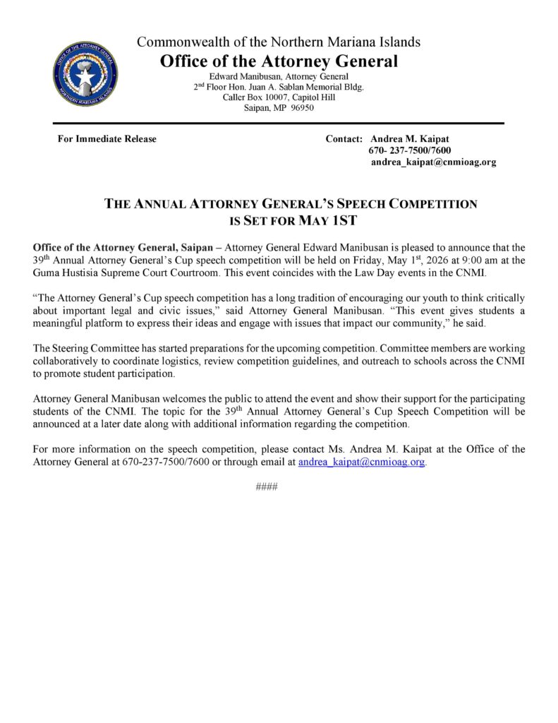 SAIPAN — Attorney General Edward Manibusan announced the CNMI’s 39th Annual Attorney General’s Cup speech competition will be held Friday, May 1, 2026, at 9:00 a.m. in the Guma Hustisia Supreme Court Courtroom.