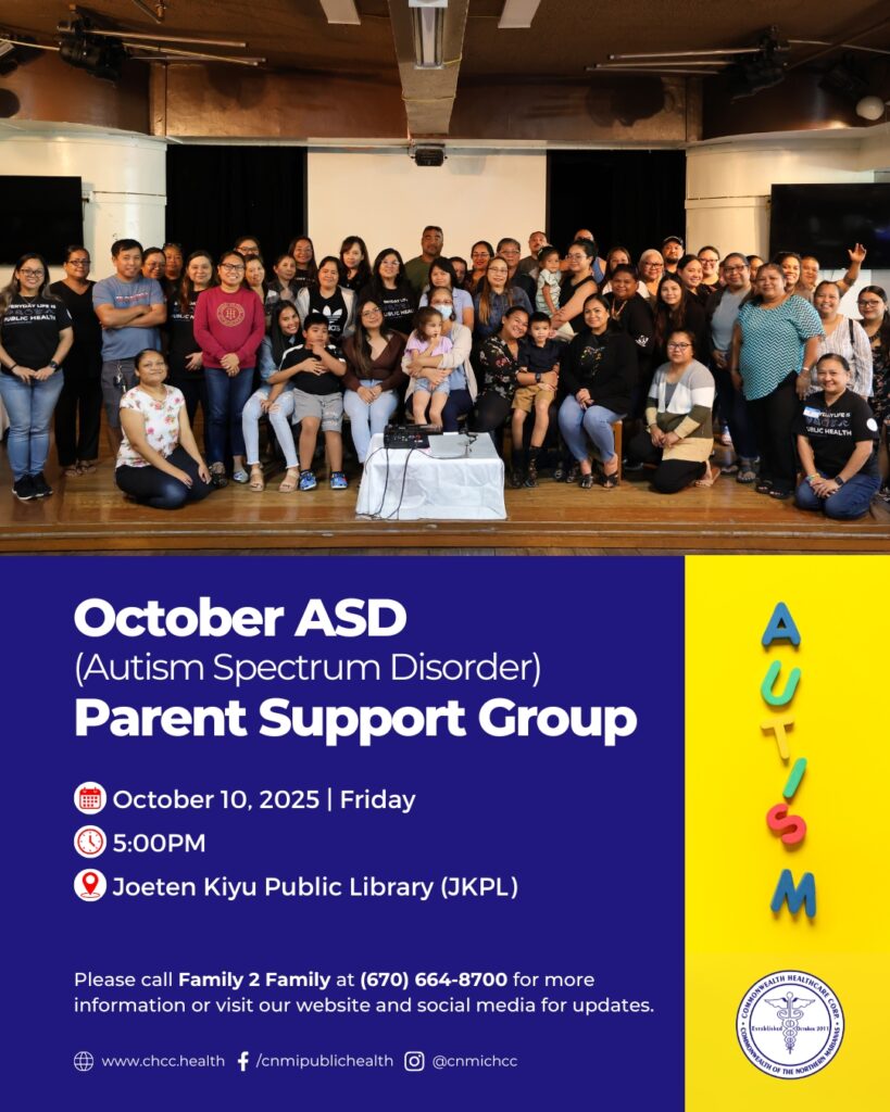 SAIPAN – Parents, caregivers, and family members of children with autism are invited to join the Autism Spectrum Disorder monthly parent support group on Friday, October 10, at the Joeten Kiyu Public Library in Susupe.