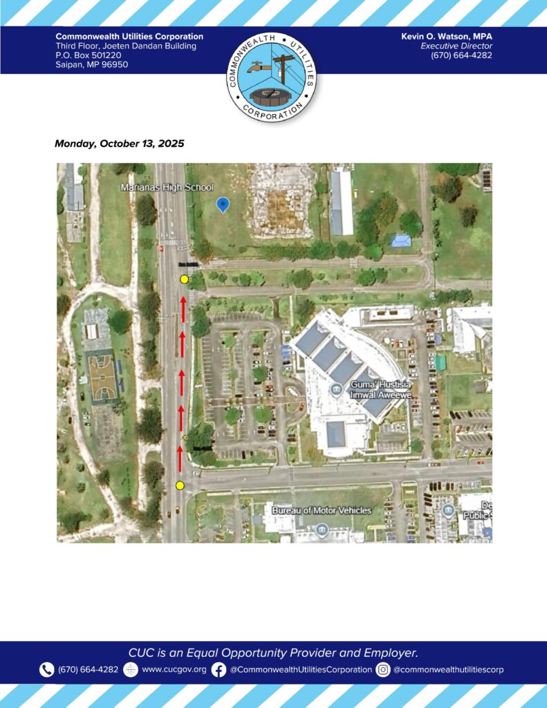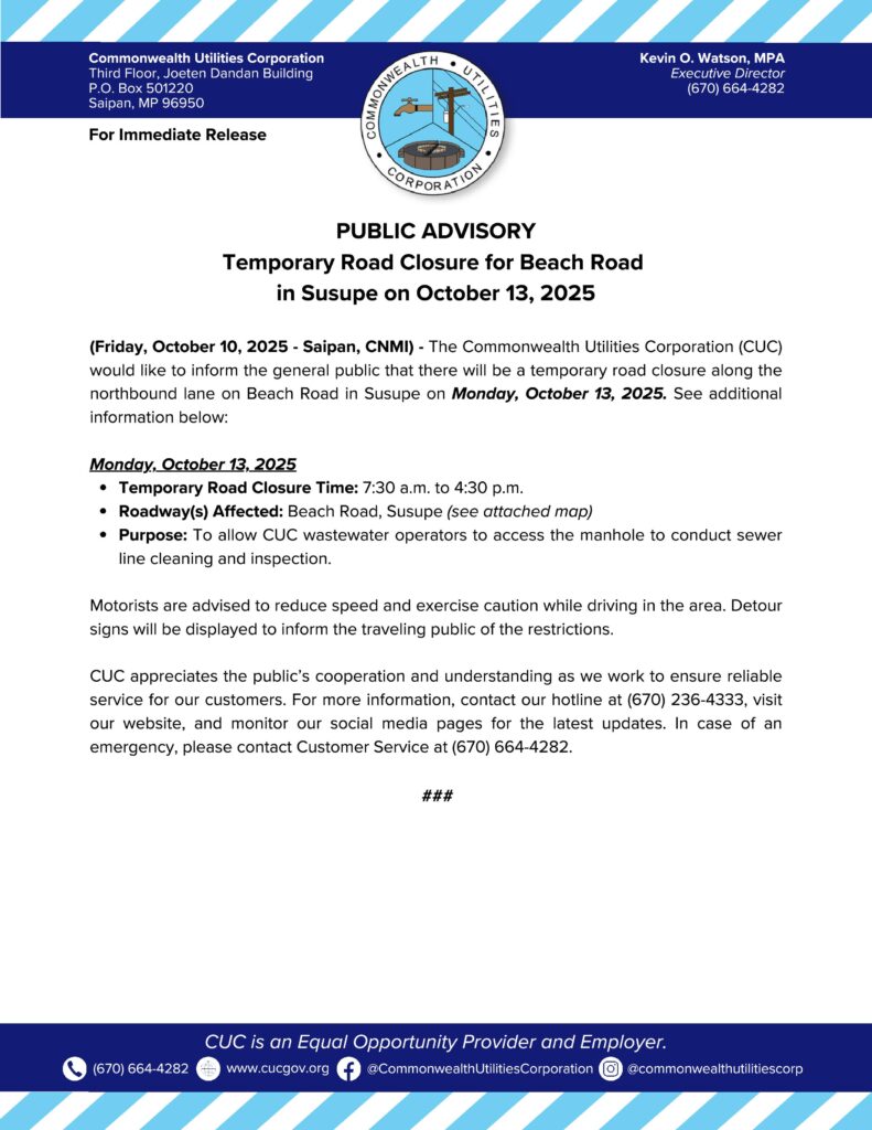 The Commonwealth Utilities Corporation is closing the northbound lane of Beach Road in Susupe today, Monday, Oct. 13, from 7:30am to 4:30pm, for wastewater system maintenance.