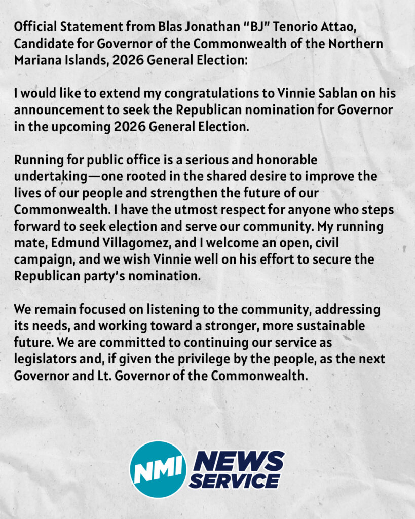 “I would like to extend my congratulations to Vinnie Sablan on his announcement to seek the Republican nomination for Governor in the upcoming 2026 General Election.