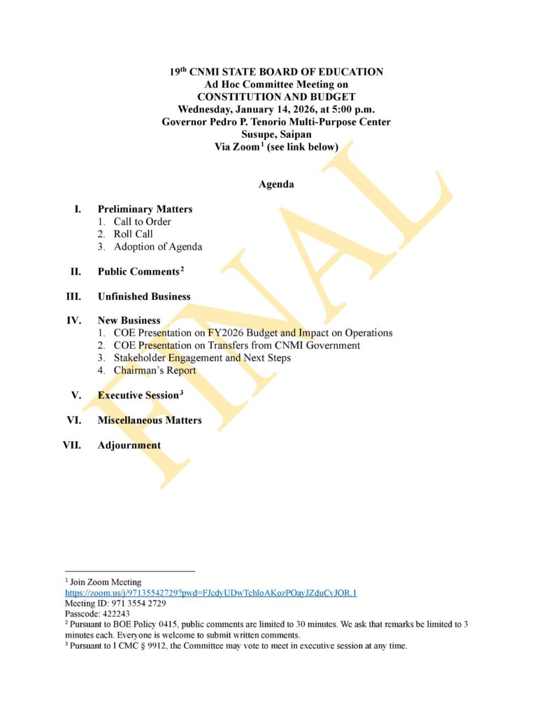 SAIPAN — All eyes of the CNMI Public School System will be focused on Susupe tomorrow evening as the CNMI State Board of Education’s Ad Hoc Committee on Constitution and Budget will hold a meeting Wednesday, January 14 at 5 p.m. at the Governor Pedro P. Tenorio Multi-Purpose Center.