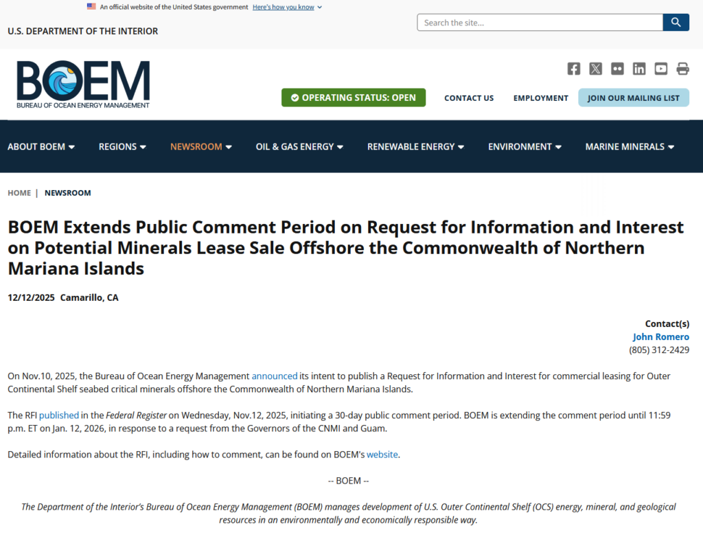 In response to a request from Governor David M. Apatang, BOEM said the new deadline for comments is January 12, 2026, at 11:59 p.m. Eastern Time. The RFI is an early-stage step to gather information and public input on whether and how the federal government should move forward with assessing offshore critical mineral resources in CNMI waters.