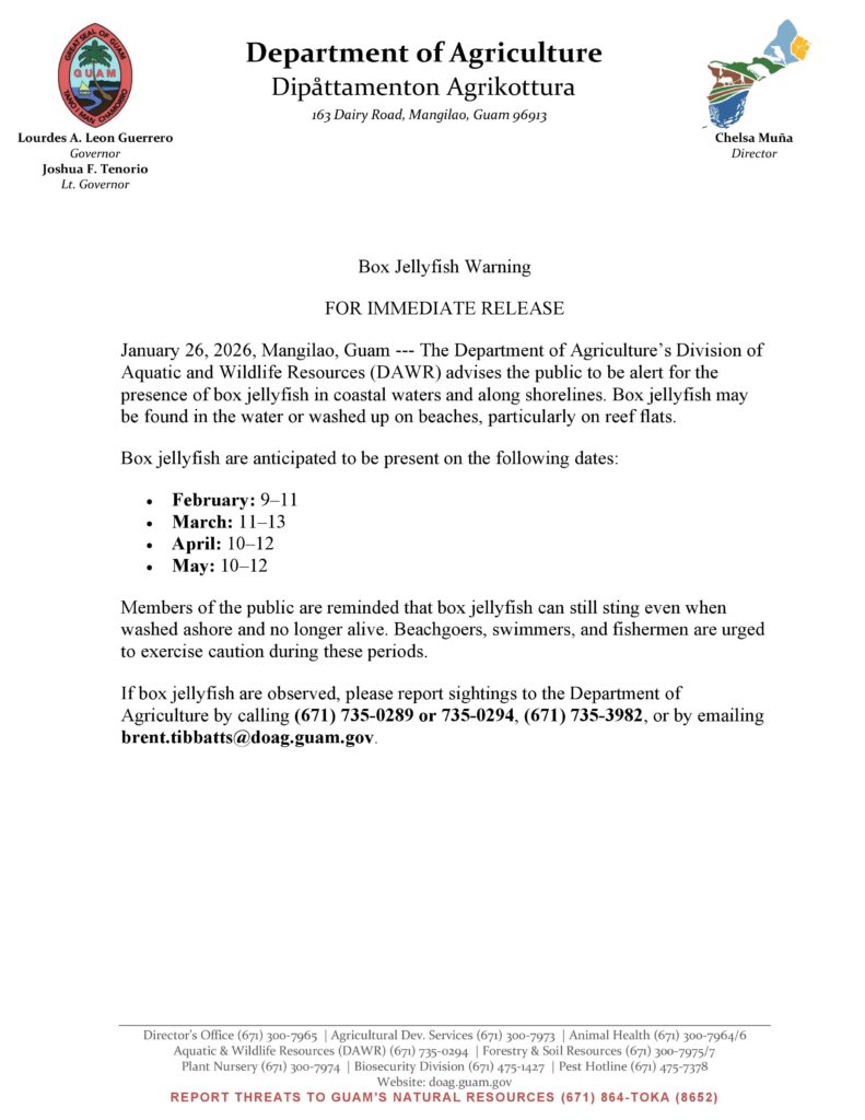 Mangilao, Guam — Guam Department of Agriculture’s Division of Aquatic and Wildlife Resources is advising the public to be alert for box jellyfish in coastal waters and along shorelines, including reef flats where they may be in the water or washed up on beaches.