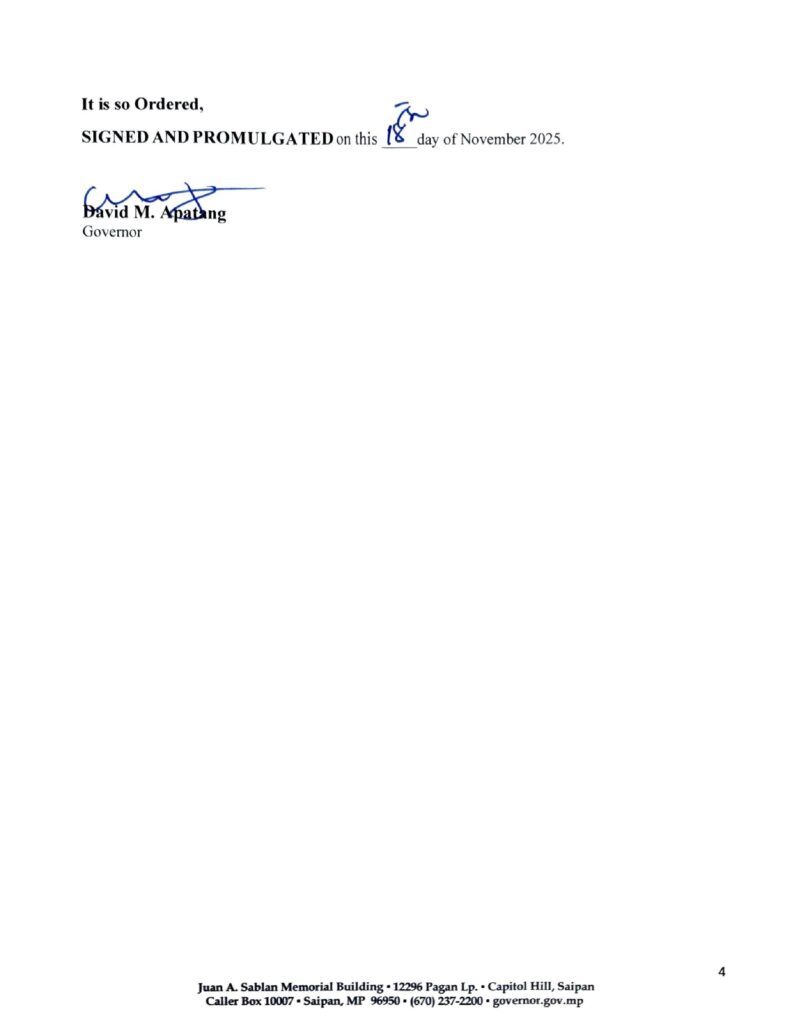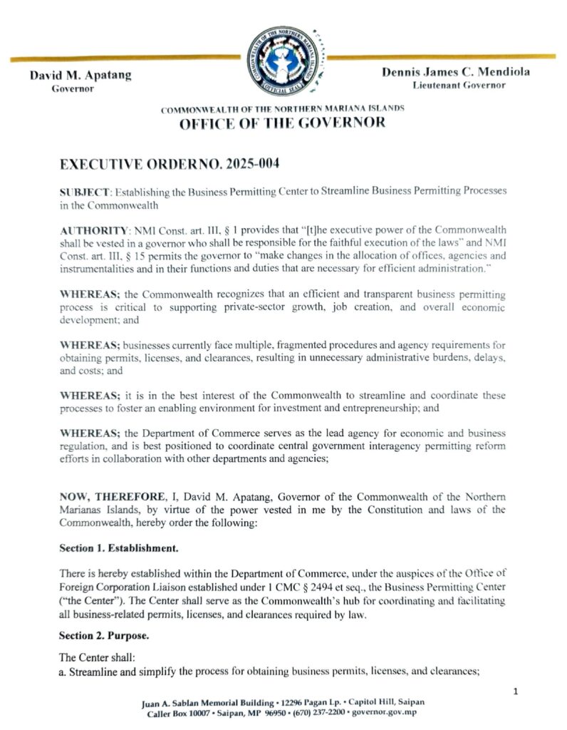 SAIPAN — Governor David M. Apatang has signed Executive Order 2025-004 establishing a new Business Permitting Center within the Department of Commerce to serve as a one-stop hub for business permits, licenses, and clearances across the CNMI government.