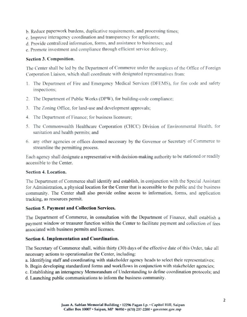 Under the executive order, the Department of Commerce will lead the Center in coordination with designated representatives from the Department of Fire and Emergency Medical Services, the Department of Public Works, the Zoning Office, the Department of Finance, and the Commonwealth Healthcare Corporation’s Division of Environmental Health, along with any other agencies identified by the governor or commerce secretary. Each participating agency must assign a representative with decision-making authority to be stationed at, or readily accessible to, the Center.