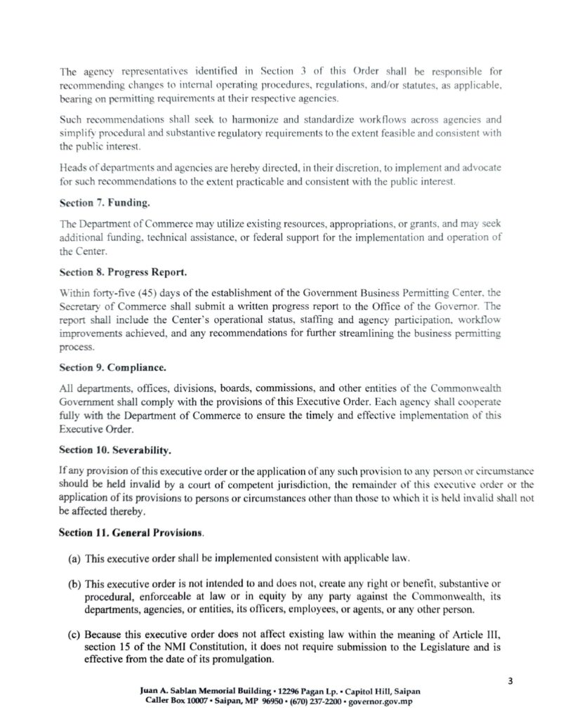The Department of Commerce may use existing resources, appropriations, and grants to support the Center and is authorized to seek additional funding or federal technical assistance. The order also includes standard severability and general provisions language and affirms that it takes effect upon promulgation without the need for legislative submission under Article II, Section 15 of the NMI Constitution.