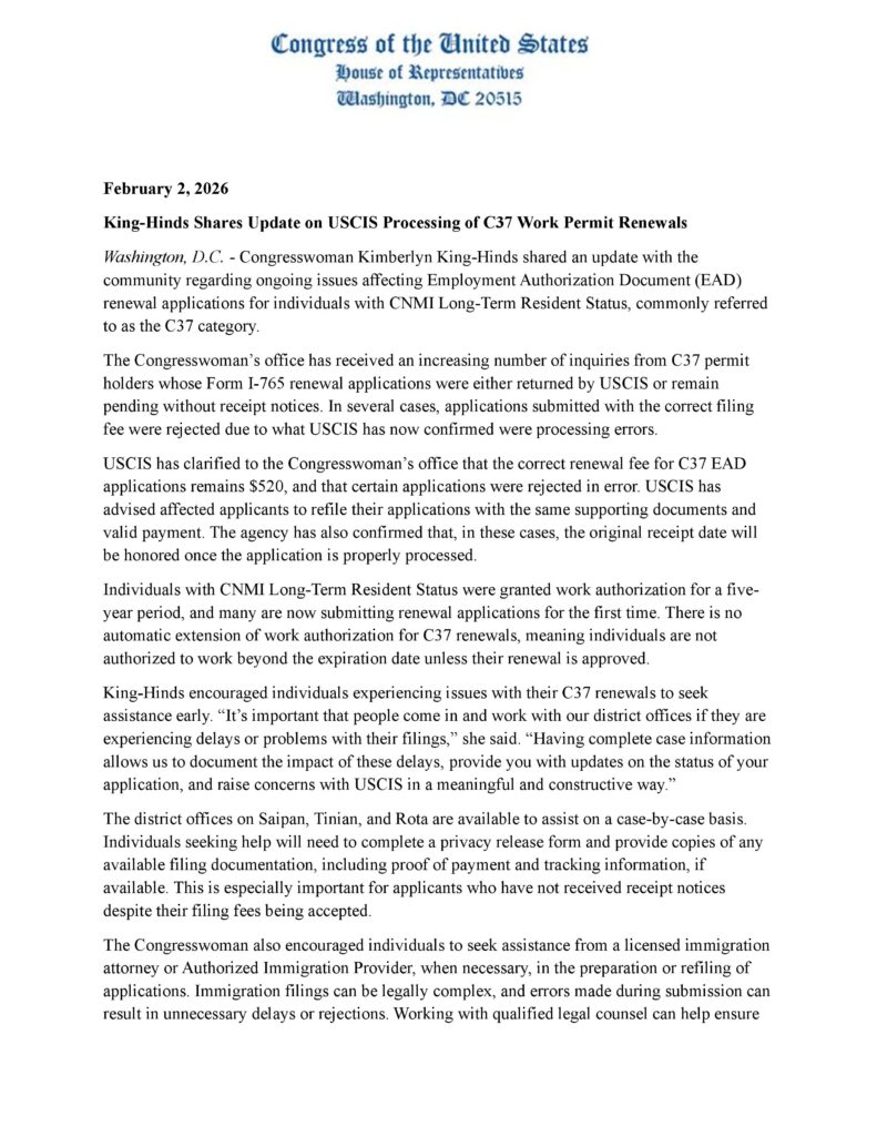 The Congresswoman also encouraged applicants to consider help from a licensed immigration attorney or authorized immigration provider when needed, noting that filing errors can lead to delays or rejections. Residents with questions about C37 renewals were encouraged to contact her district office at (670) 323-2347 or (670) 323-2348, or visit a district office for guidance.