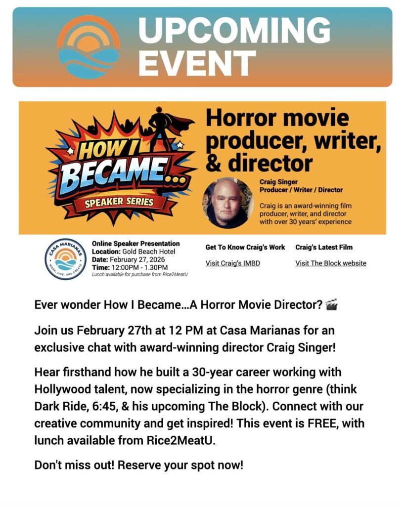 Casa Marianas said the event is free and is intended to bring together members of the local creative community while offering firsthand insight into Singer’s path as a producer, director, and writer.