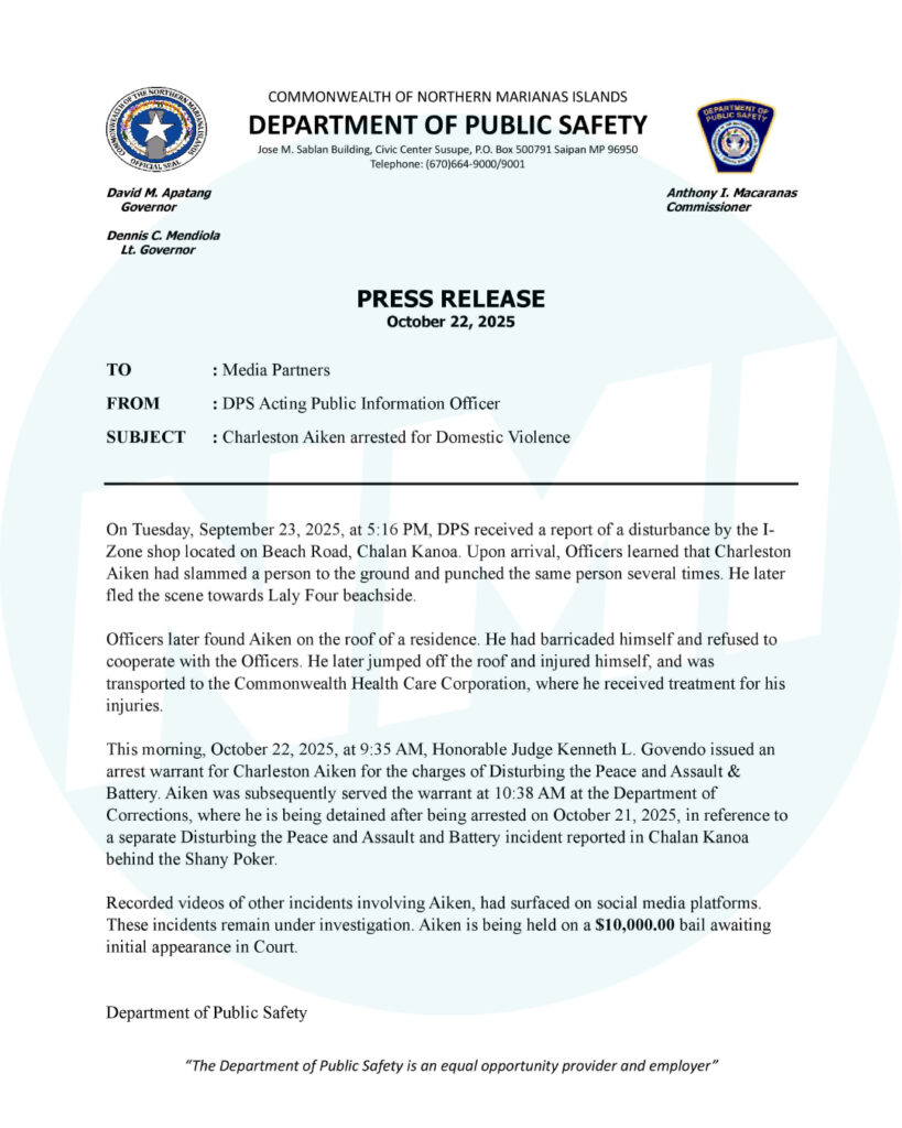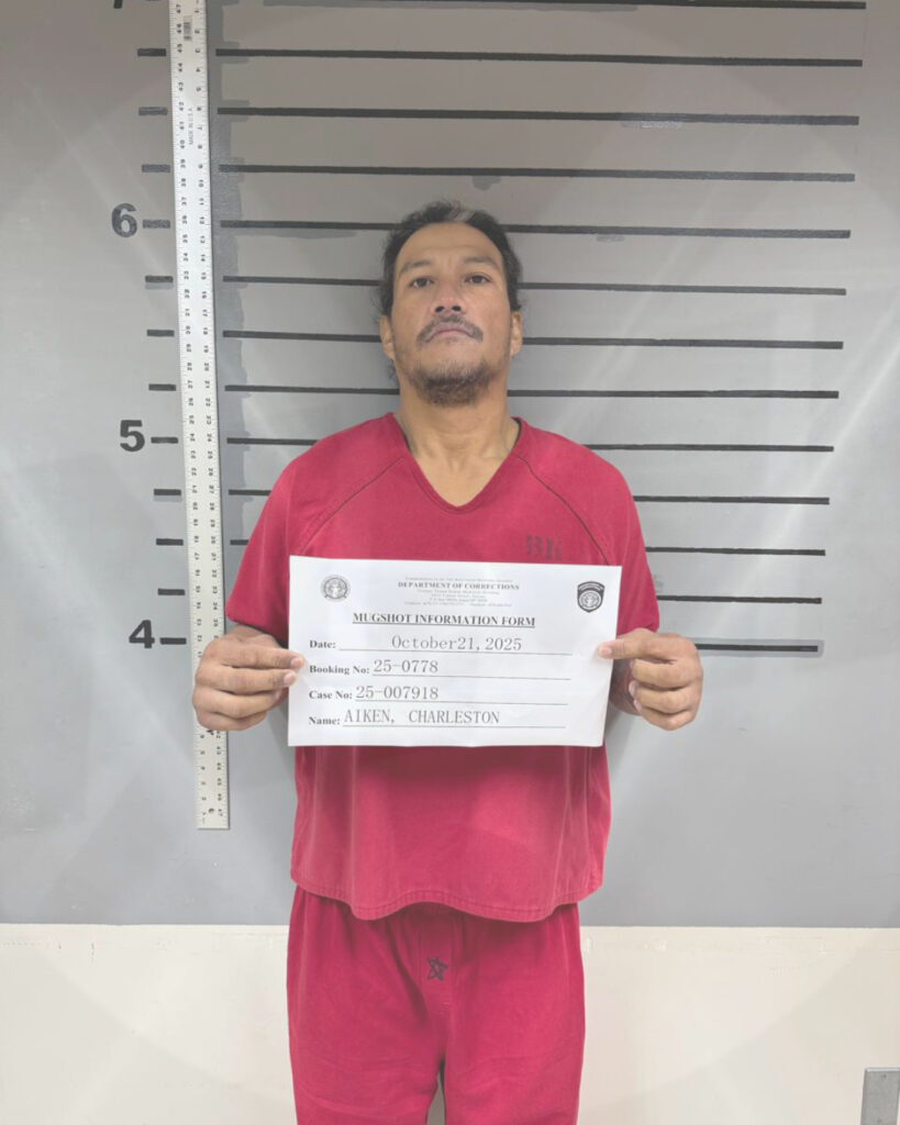 SAIPAN – Charleston Aiken is being held on $10,000 bail after a judge issued an arrest warrant Wednesday morning for Disturbing the Peace and Assault & Battery, according to the Department of Public Safety. Aiken was served the warrant at 10:38 a.m. at the Department of Corrections, where he is detained following a separate arrest on Oct. 21 connected to another disturbance and assault-and-battery case reported behind Shany Poker in Chalan Kanoa.