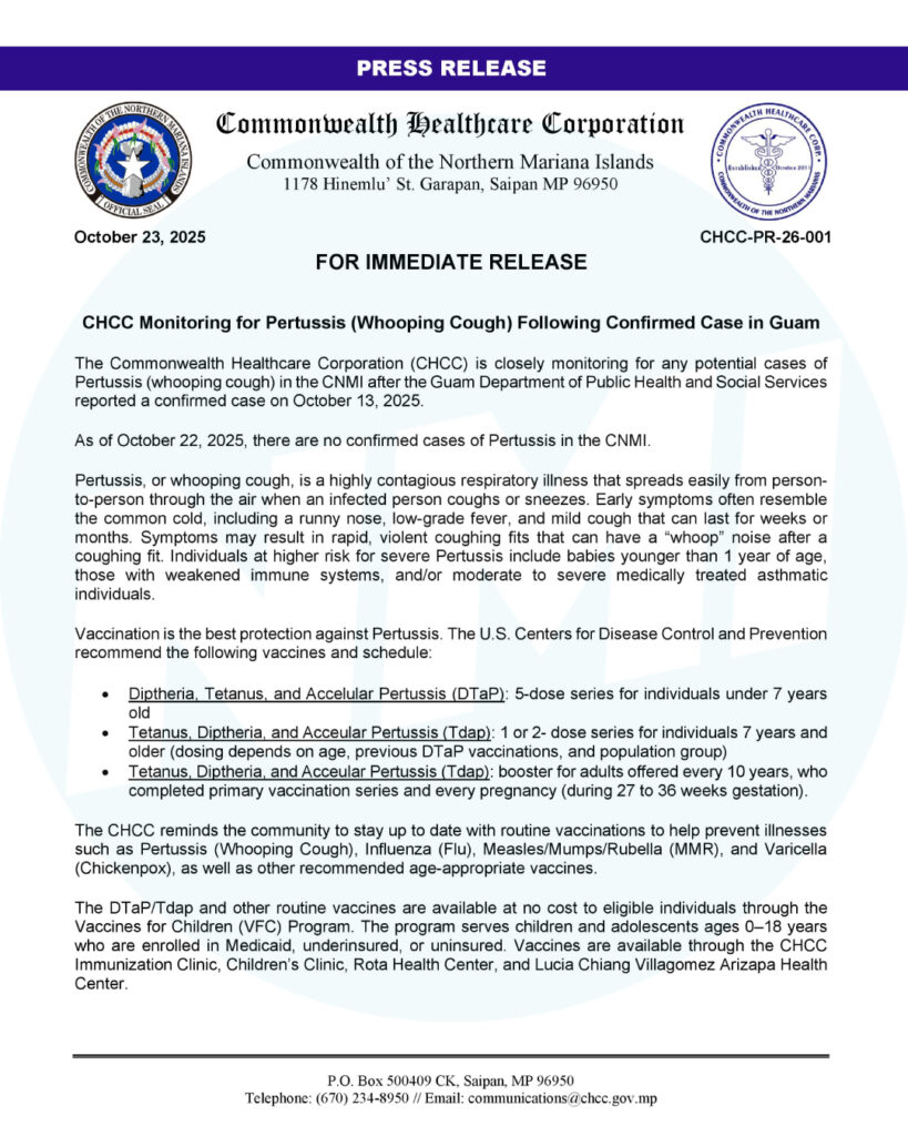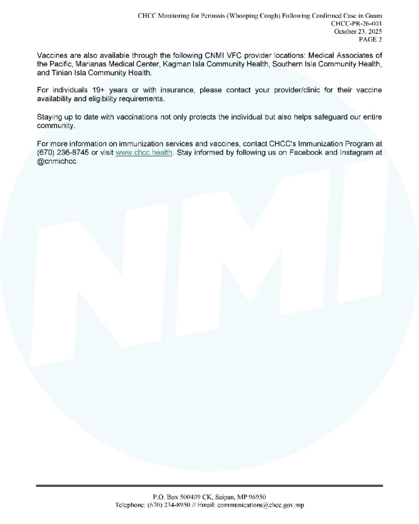 SAIPAN — The Commonwealth Healthcare Corporation is monitoring for pertussis (whooping cough) in the CNMI after Guam confirmed a case on Oct. 13. As of Oct. 22, there are no confirmed pertussis cases in the CNMI, CHCC said