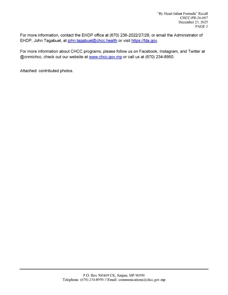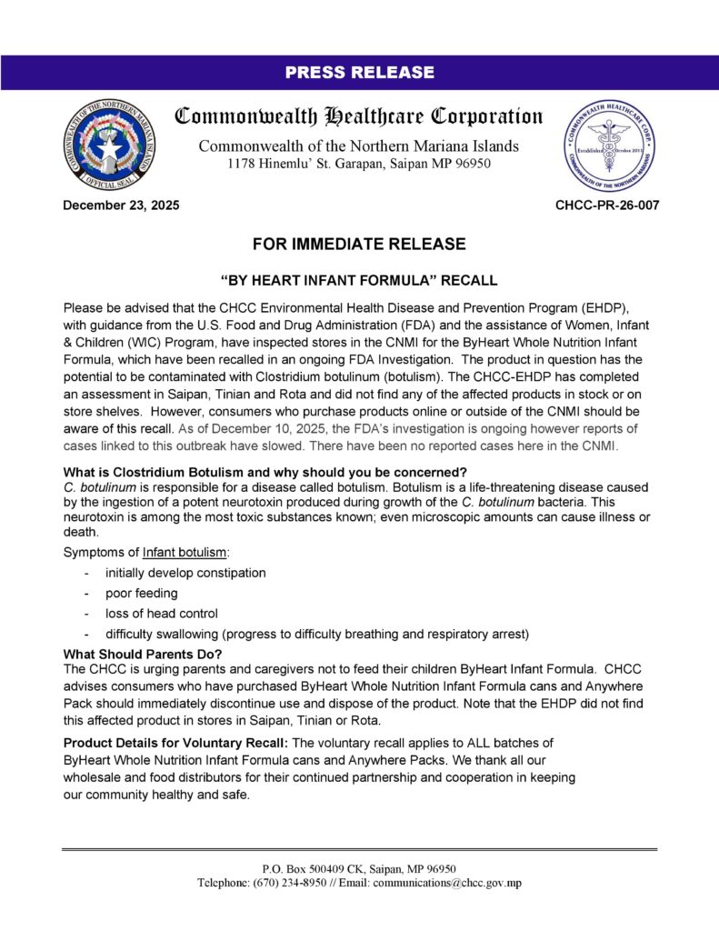 SAIPAN – The Commonwealth Healthcare Corporation has confirmed that no recalled ByHeart Whole Nutrition Infant Formula has been found in stores across Saipan, Tinian, or Rota following inspections prompted by an ongoing U.S. Food and Drug Administration investigation into potential botulism contamination.