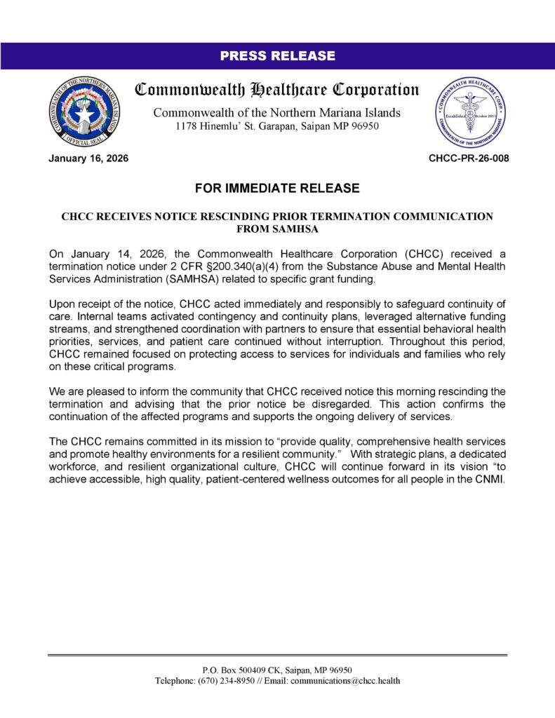 SAIPAN — The Commonwealth Healthcare Corporation said Friday it has received notice from the Substance Abuse and Mental Health Services Administration rescinding a prior termination communication tied to specific grant funding, an update CHCC says confirms the continuation of the affected programs.