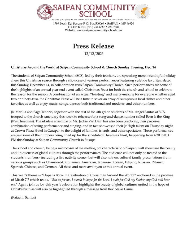 Saipan Community School and Saipan Community Church are inviting the public to their annual Christmas Feast this Sunday, Dec. 14, from 4:30–8:00 p.m. in Susupe. The evening will feature student performances, a ukulele ensemble, a live nativity scene, and family cultural presentations representing Chamorro-Carolinian, American, Japanese, Korean, Filipino, Russian, Palauan, Spanish, Chinese, and German traditions — all under the theme “Hope Is Born: In Celebration of Christmas Around the World.”