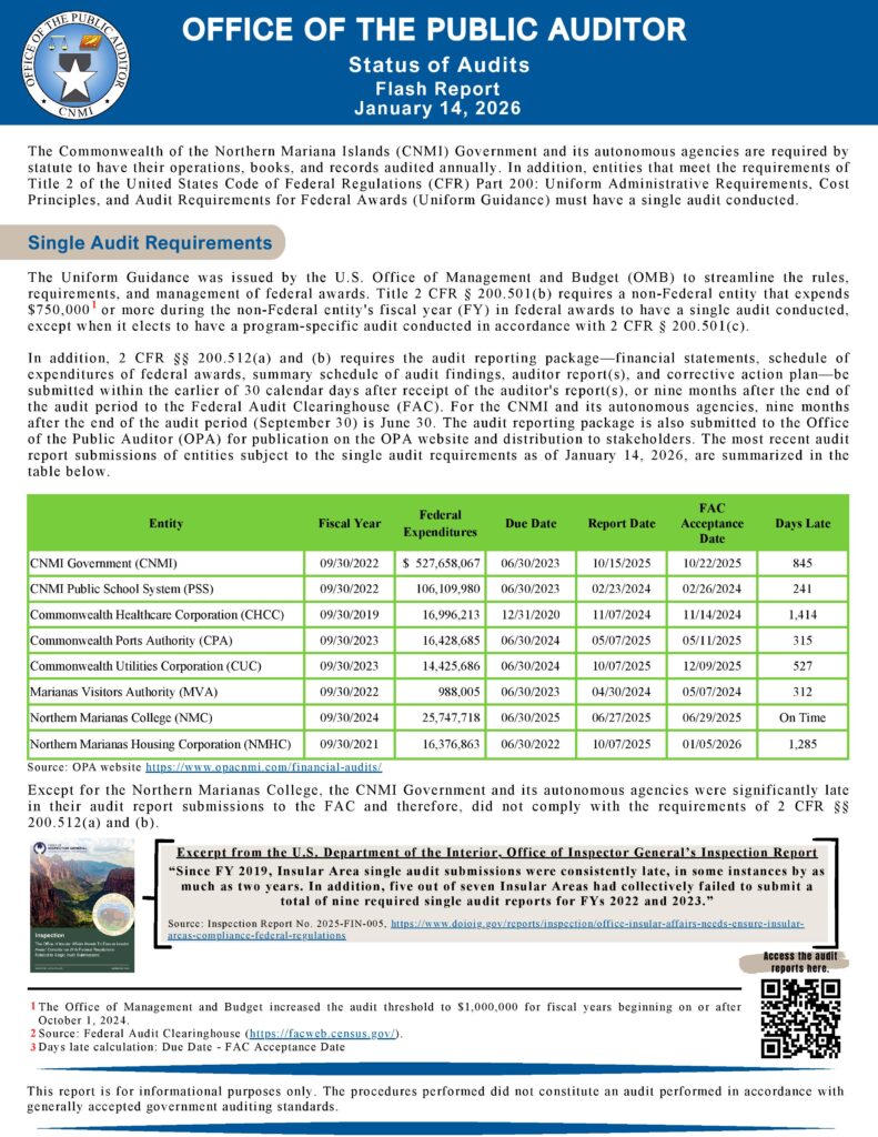SAIPAN — The Office of the Public Auditor says the CNMI government and several autonomous agencies have been significantly late in submitting required single audit reports tied to federal funding, a pattern the office warns can trigger serious federal consequences if not corrected.