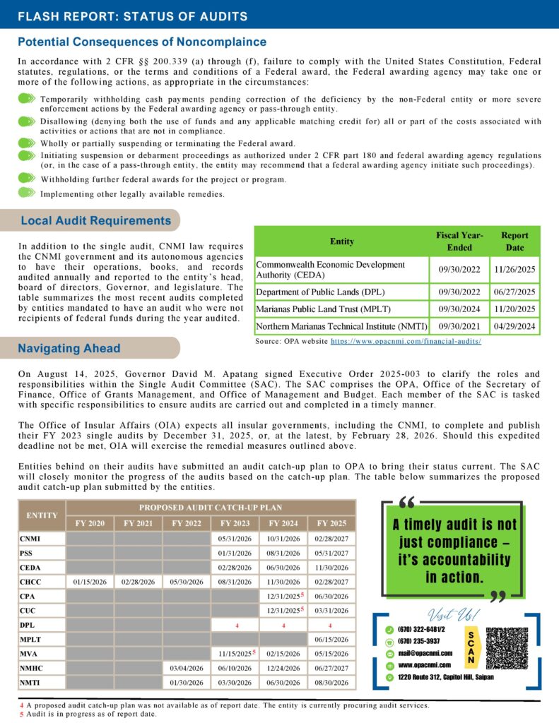 OPA noted that Governor David M. Apatang signed Executive Order 2025-003 on Aug. 14, 2025, to clarify roles and responsibilities within the CNMI Single Audit Committee, which includes OPA, the Office of the Secretary of Finance, the Office of Grants Management, and the Office of Management and Budget.