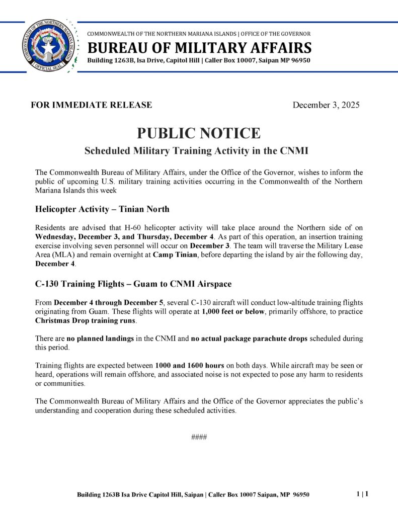 SAIPAN — The CNMI Bureau of Military Affairs issued a public notice advising residents of scheduled U.S. military training activity in the Commonwealth this week.