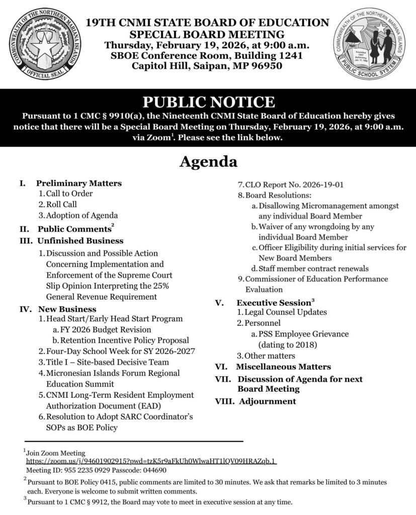 SAIPAN — In a post this morning on social media, the CNMI State Board of Education has scheduled a special board meeting for tomorrow Thursday, February 19, at 9:00 a.m., with the meeting to be held at the SBOE Conference Room.