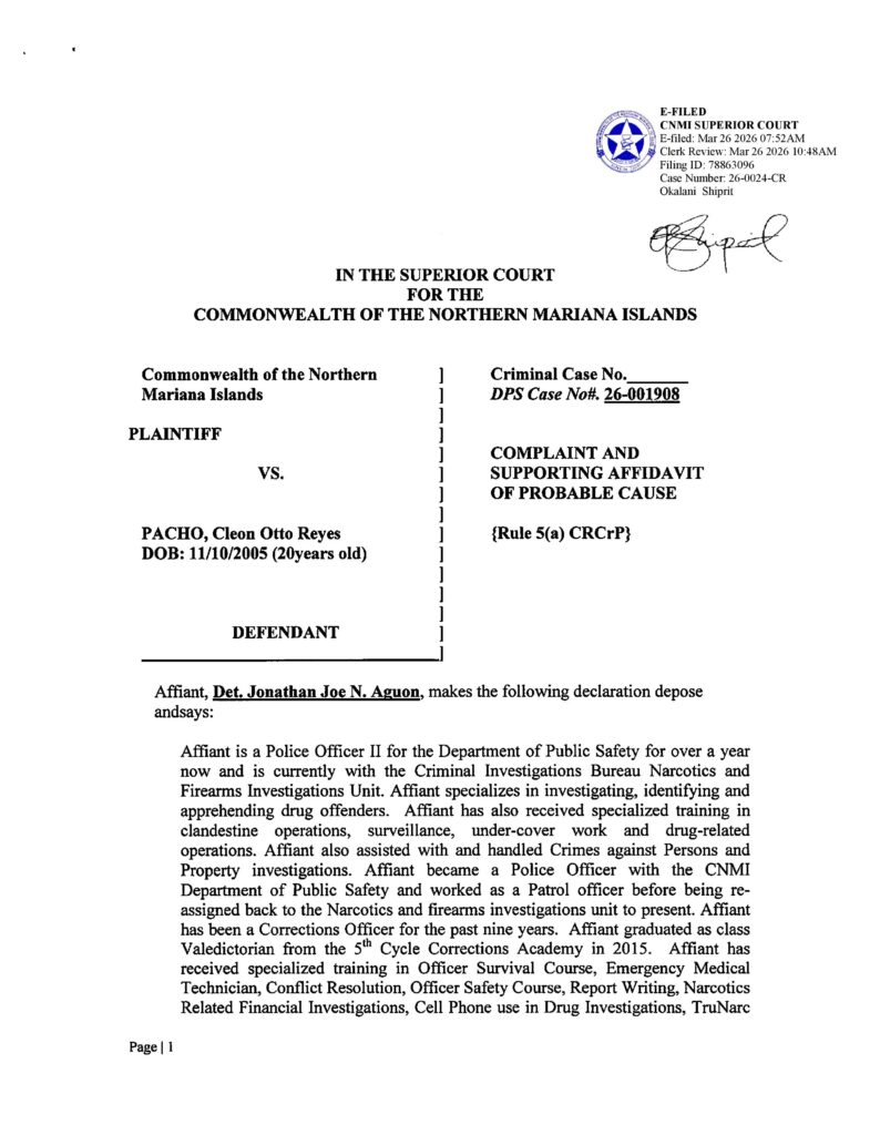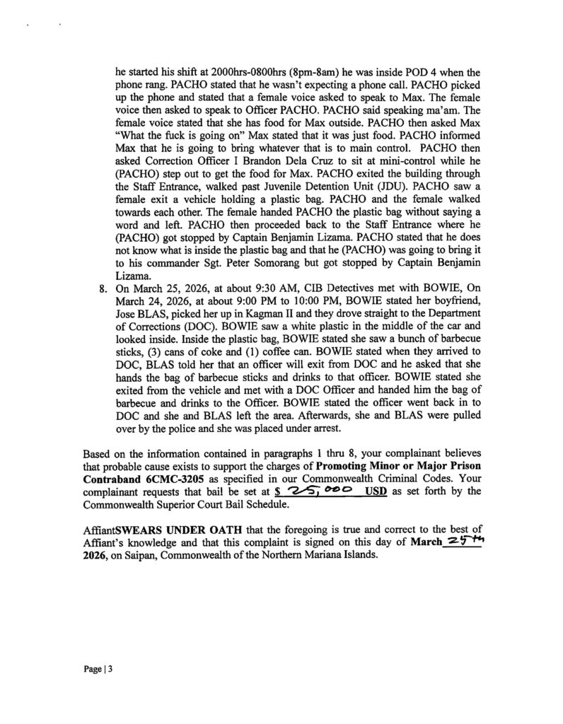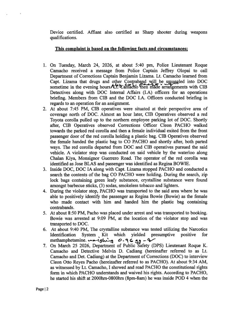 According to the affidavit of probable cause sworn by DPS Detective Jonathan Joe N. Aguon, the operation began the evening of March 24 after DOC Captain Benjamin Lizama tipped off police that drugs and other contraband were expected to be smuggled into the facility. CIB operatives and DOC Internal Affairs officers were briefed and set up surveillance north of the facility.