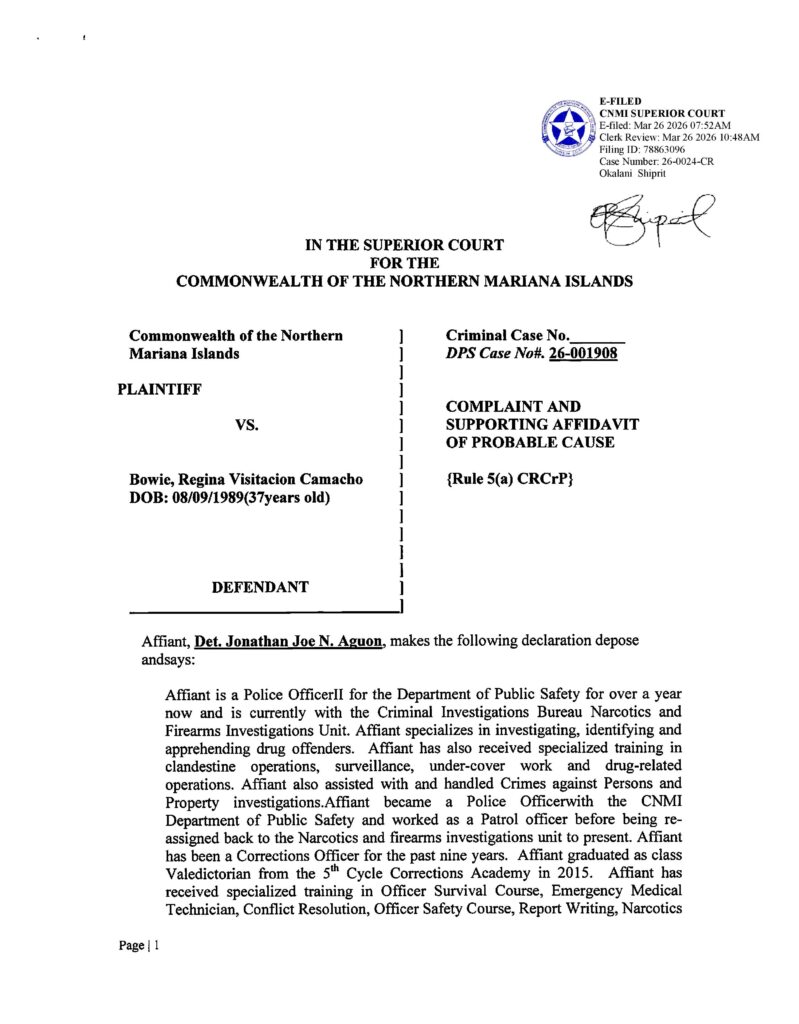 SAIPAN — Corrections Officer Cleon Otto Reyes Pacho and Regina Visitacion Camacho Bowie made their initial appearances Thursday in CNMI Superior Court before Judge Kenneth Govendo, one day after criminal complaints were filed charging both with promoting prison contraband.
