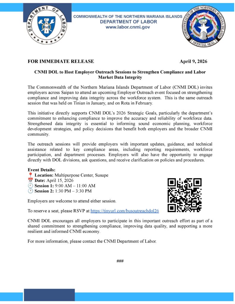 SAIPAN — The CNMI Department of Labor is inviting Saipan employers to attend employer outreach sessions on April 15 at the Multipurpose Center in Susupe, focused on compliance and labor market data integrity.