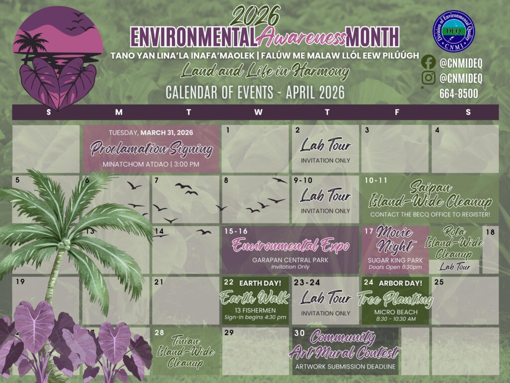 SAIPAN — The Bureau of Environmental and Coastal Quality’s Division of Environmental Quality has launched Environmental Awareness Month for April, with a full schedule of events planned across Saipan, Tinian and Rota under the theme “Tåno yan Lina’la Inafa’måolek / Falúw Me Malaw Llól Eew Pilúúgh / Land and Life in Harmony.”