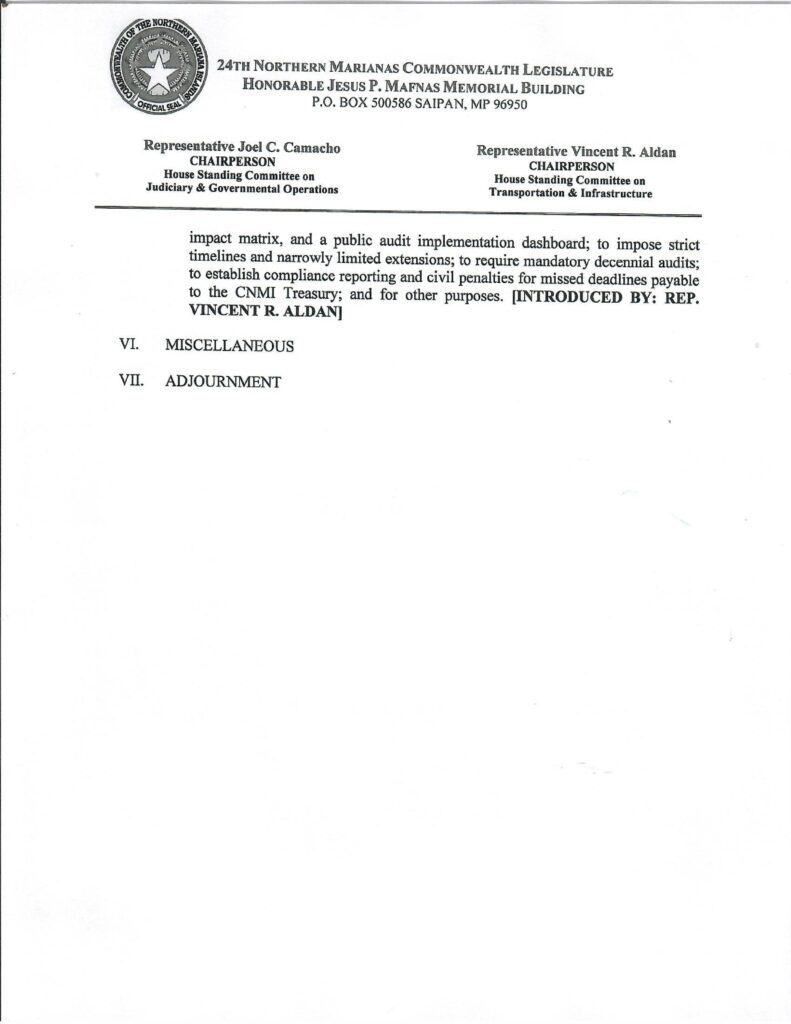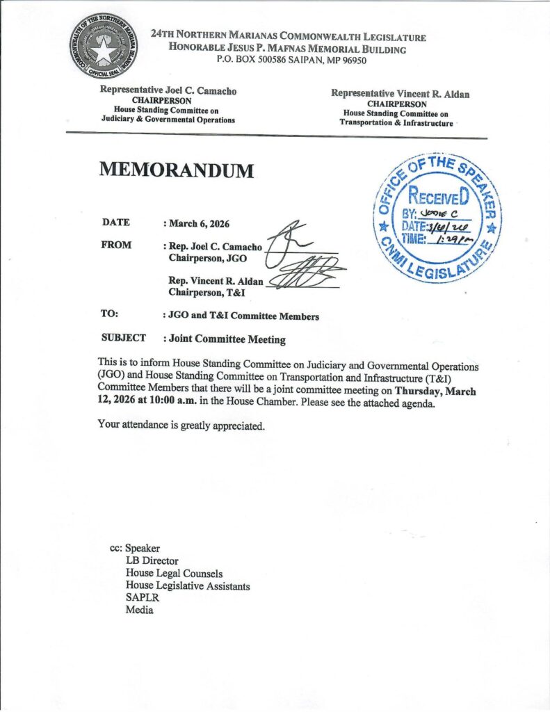 The joint meeting of the House Standing Committee on Judiciary and Governmental Operations and the House Standing Committee on Transportation and Infrastructure is scheduled for Thursday, March 12 at 10 a.m. in the House Chamber. The committees are chaired respectively by Rep. Joel C. Camacho and Rep. Vincent R. Aldan.