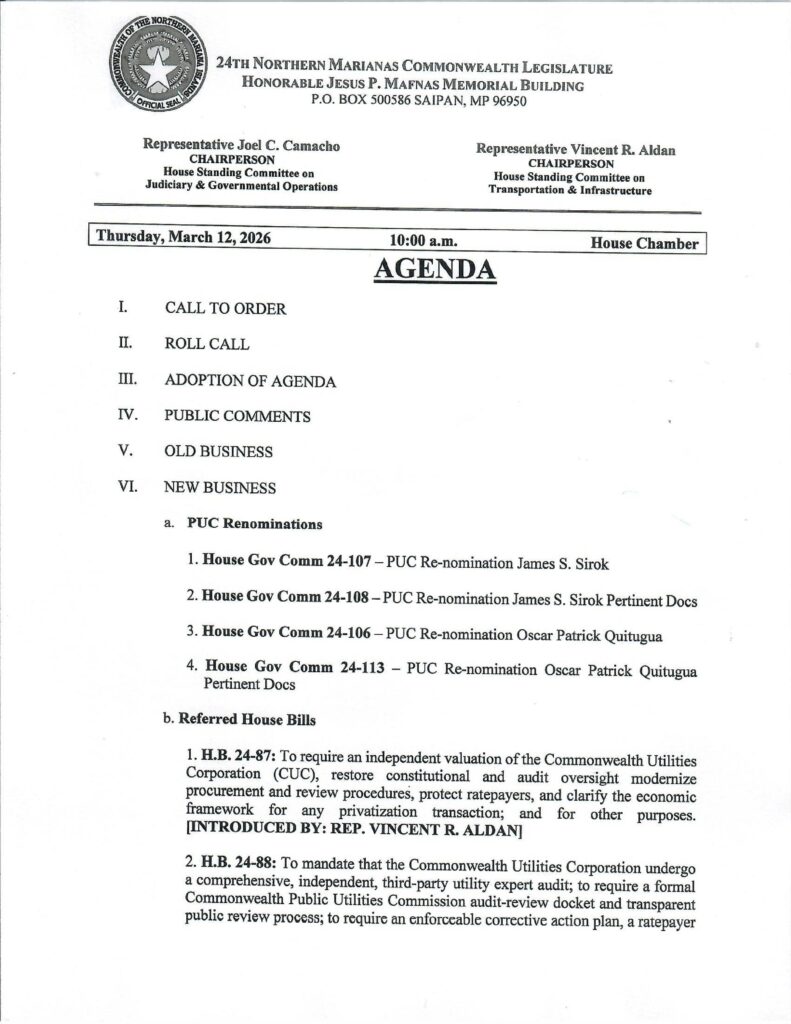 SAIPAN — Two House standing committees will meet jointly next Thursday to consider a pair of bills targeting the Commonwealth Utilities Corporation and to review the renominations of two Public Utilities Commission members.