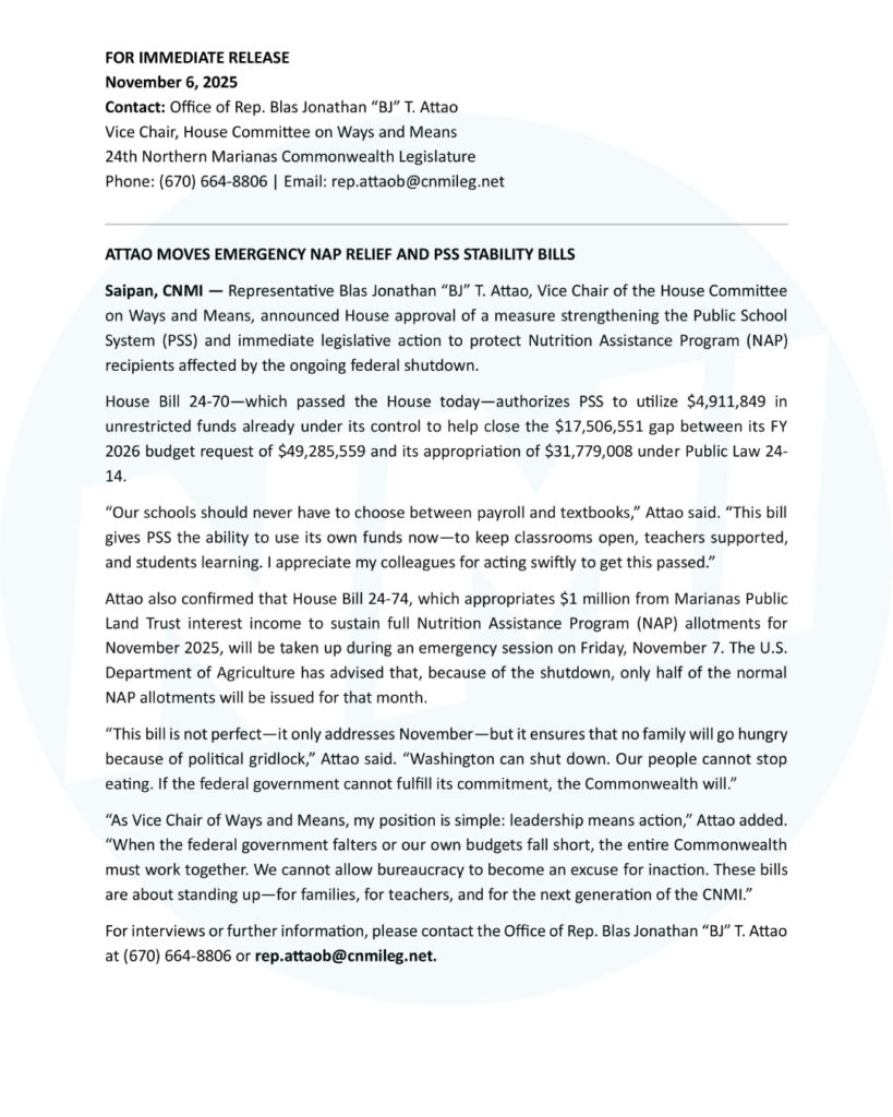 Separately, the House teed up HB 24-74 for action tomorrow. The bill would appropriate $1 million from Marianas Public Land Trust interest earnings to ensure NAP recipients receive their full November allotments. The U.S. Department of Agriculture has advised that, because of the shutdown, only half benefits would otherwise be issued this month.