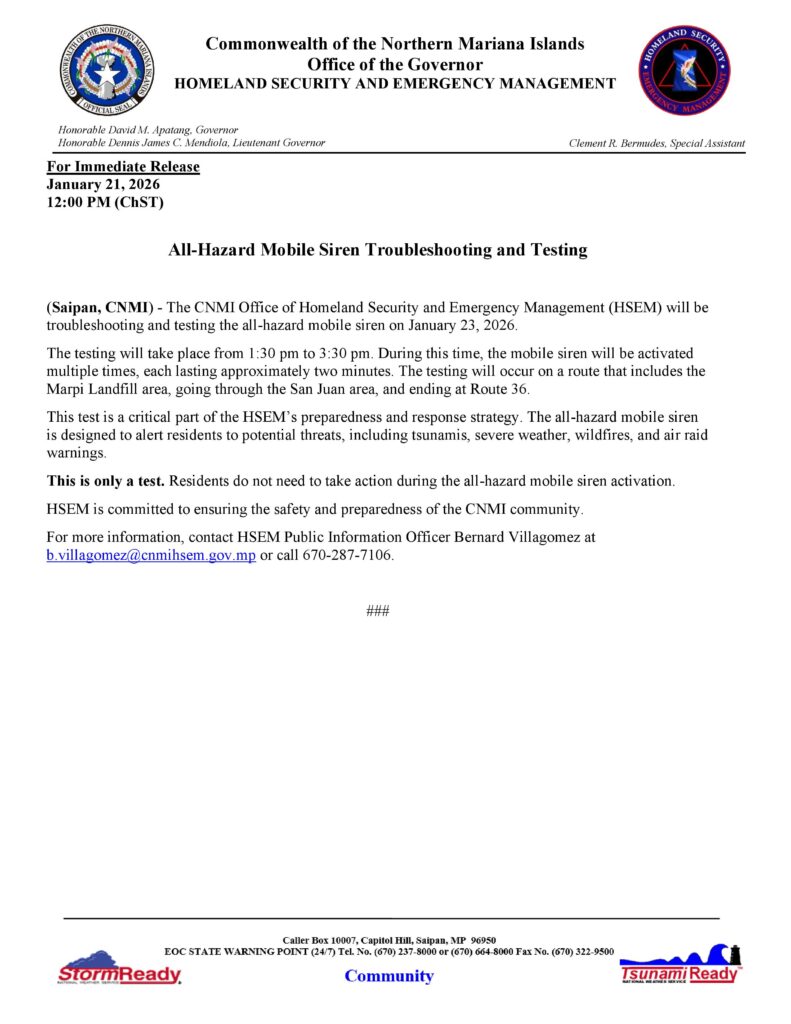 SAIPAN — The CNMI Office of Homeland Security and Emergency Management will be troubleshooting and testing its all-hazard mobile siren this Friday, January 23.