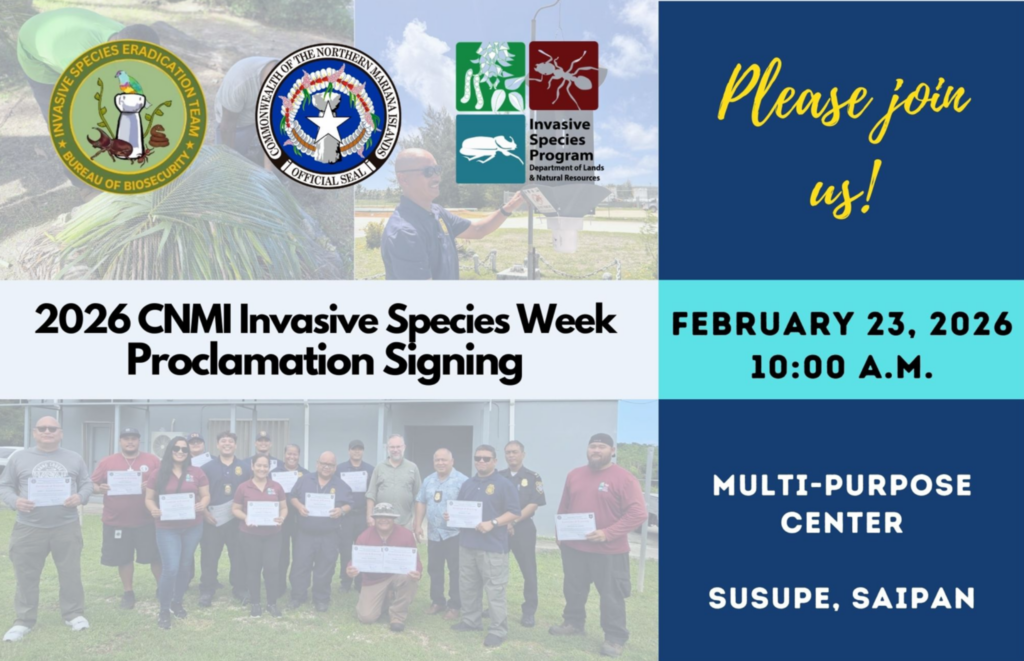 SAIPAN — The CNMI’s first-ever Invasive Species Week will officially begin Monday morning with a proclamation signing ceremony in Susupe, according to an invitation sent to media partners by the CNMI Invasive Species Week Planning and Coordination Team.