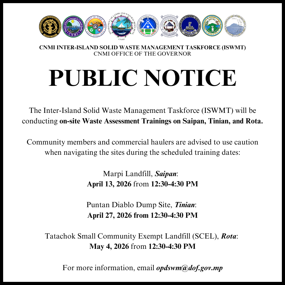 SAIPAN — The CNMI Inter-Island Solid Waste Management Taskforce will conduct on-site Waste Assessment Trainings at landfill facilities on all three main islands this spring, with community members and commercial haulers advised to use caution during the scheduled training dates.