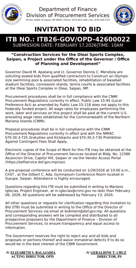 CNMI Procurement issued ITB26-GOV/OPD-42600022 seeking contractors for construction at Oleai Sports Complex in Saipan, including an Olympic-size swimming pool plus rehabilitation of baseball stadium facilities and upgrades to concession stands and tennis courts. Pre-proposal conference: Jan. 29 (10 a.m., Susupe). Bids due: Feb. 17 (10 a.m.). Questions due: Feb. 6; responses expected by Feb. 13.