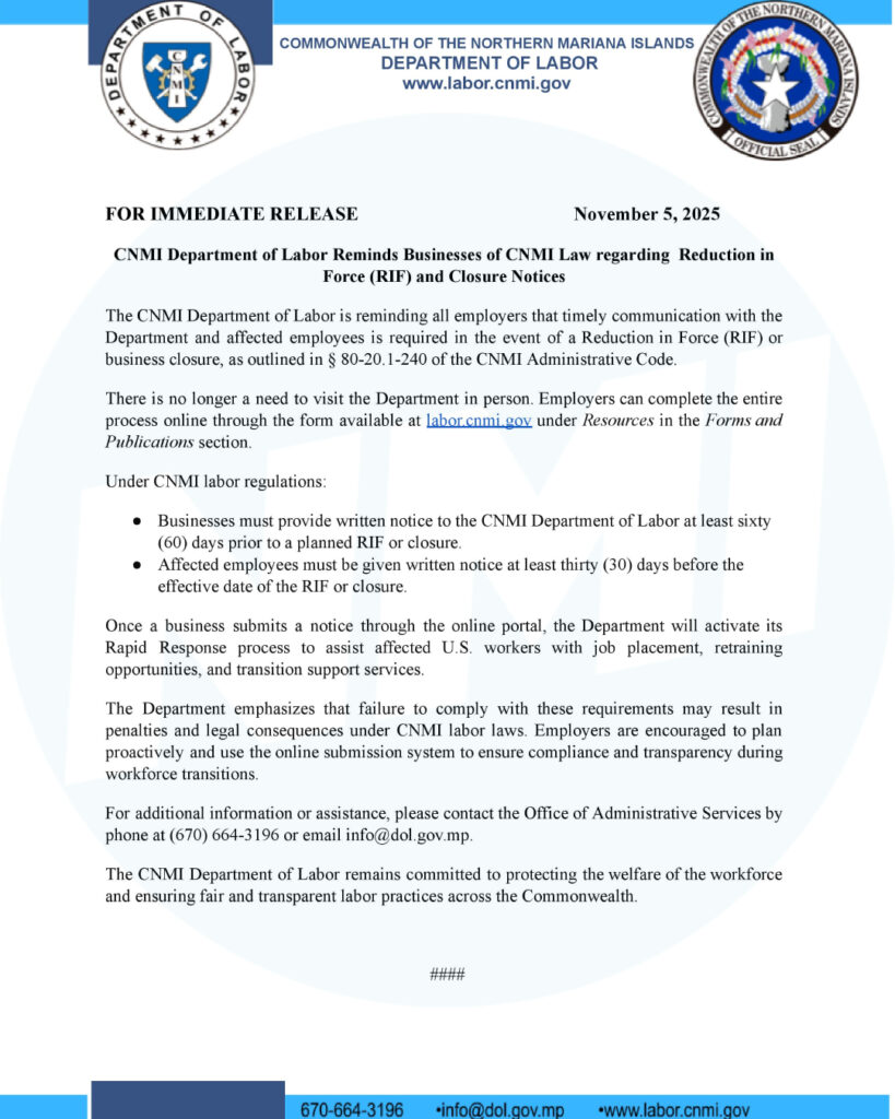 SAIPAN — The CNMI Department of Labor is reminding employers that timely written notices are required before a reduction in force (RIF) or business closure, and that the process can be completed online.