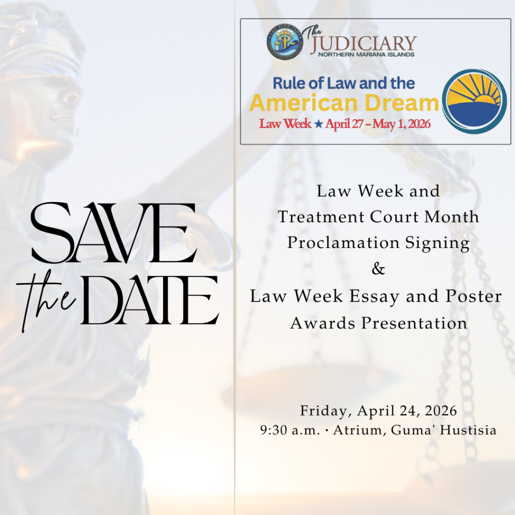 SAIPAN — The CNMI Judiciary will hold a proclamation signing and student awards presentation April 24 to kick off Law Week 2026, which runs April 27 through May 1 under the theme “Rule of Law and the American Dream.”
