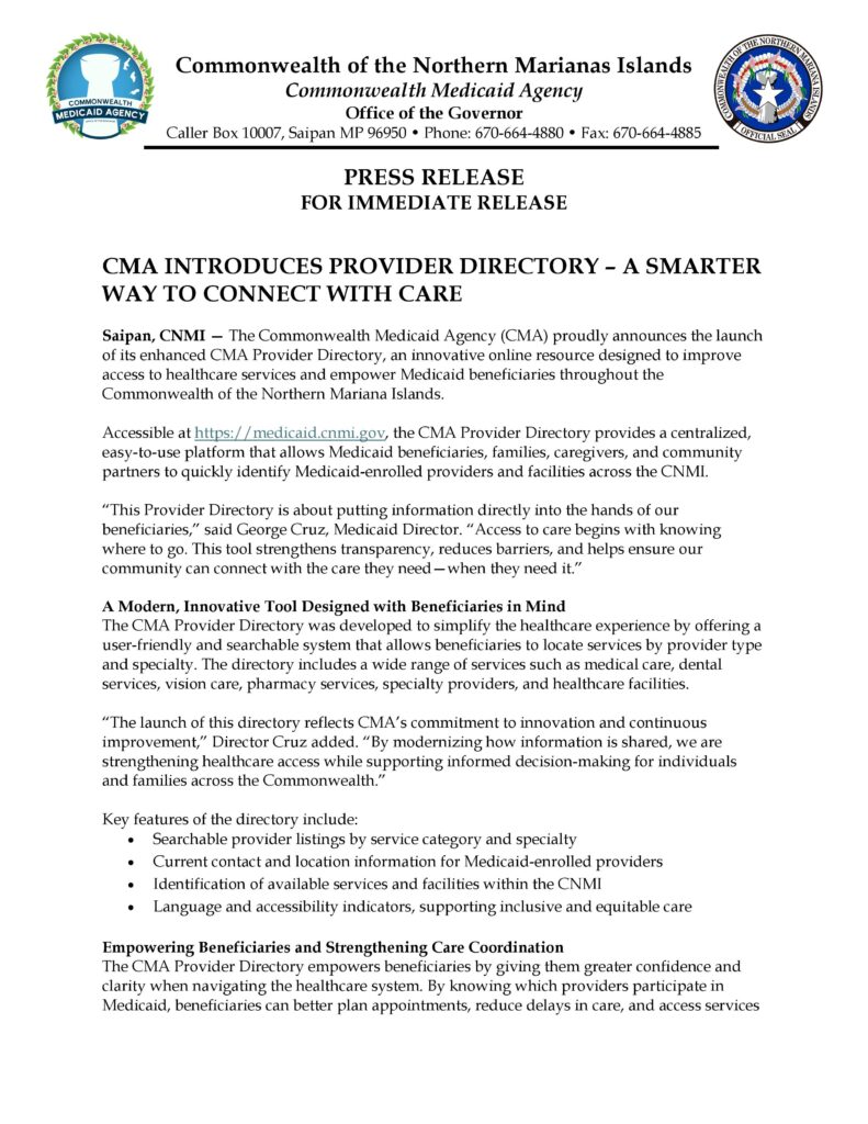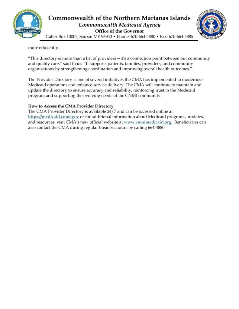 SAIPAN — The Commonwealth Medicaid Agency has launched an enhanced online CMA Provider Directory aimed at improving access to healthcare services and helping Medicaid beneficiaries connect with enrolled providers across the Commonwealth.
