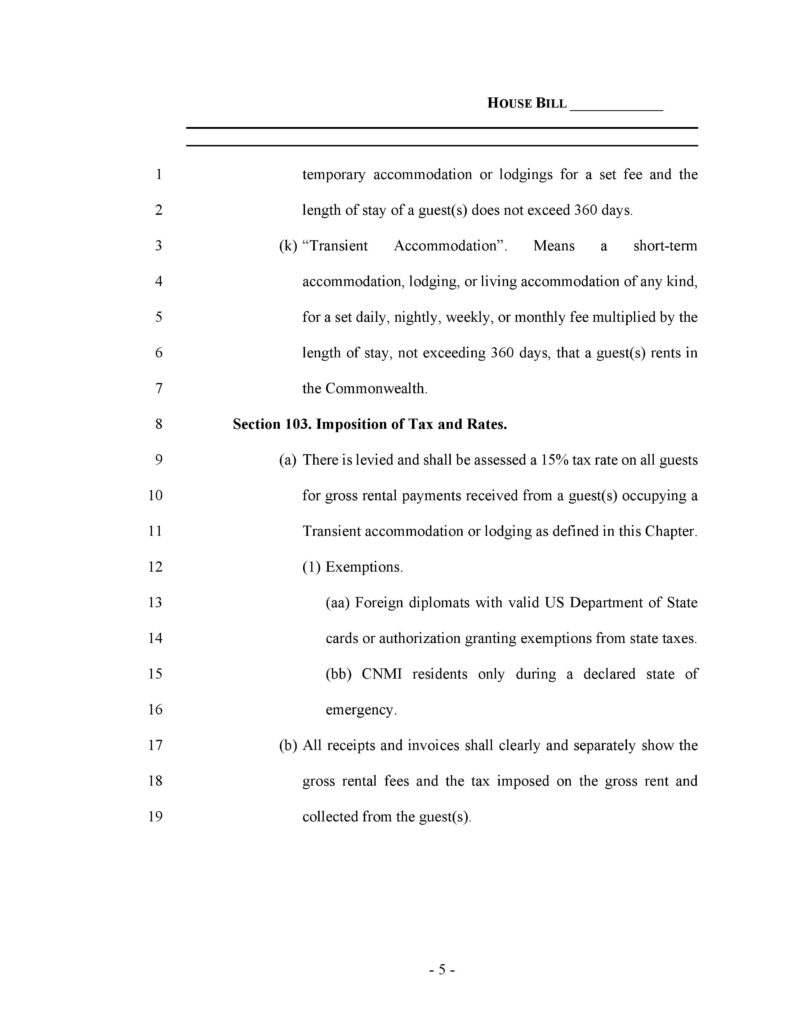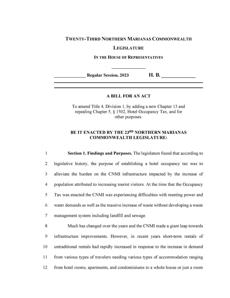 SAIPAN — A bill prefiled in the CNMI House of Representatives would scrap the existing hotel occupancy tax and replace it with a broader transient accommodation tax covering not just hotels but short-term rental properties listed on platforms like Airbnb and Vrbo.