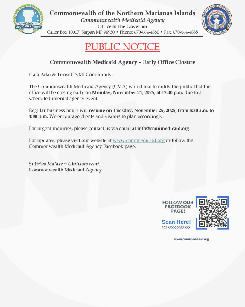 SAIPAN — The Commonwealth Medicaid Agency will close its office early on Monday, Nov. 24, 2025, for an internal agency event, and is asking clients to plan visits around the adjusted schedule.