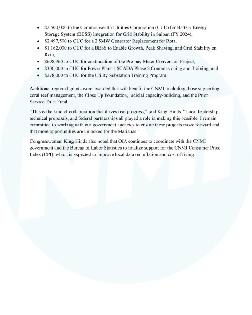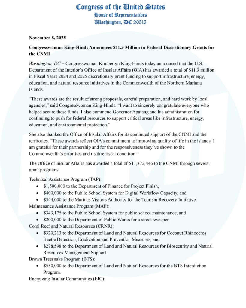 SAIPAN — Congresswoman Kimberlyn King‑Hinds announced that the U.S. Department of the Interior’s Office of Insular Affairs has awarded $11,372,446 in Fiscal Years 2024 and 2025 discretionary grants to support infrastructure, energy, education, and natural‑resource initiatives in the Commonwealth of the Northern Mariana Islands.