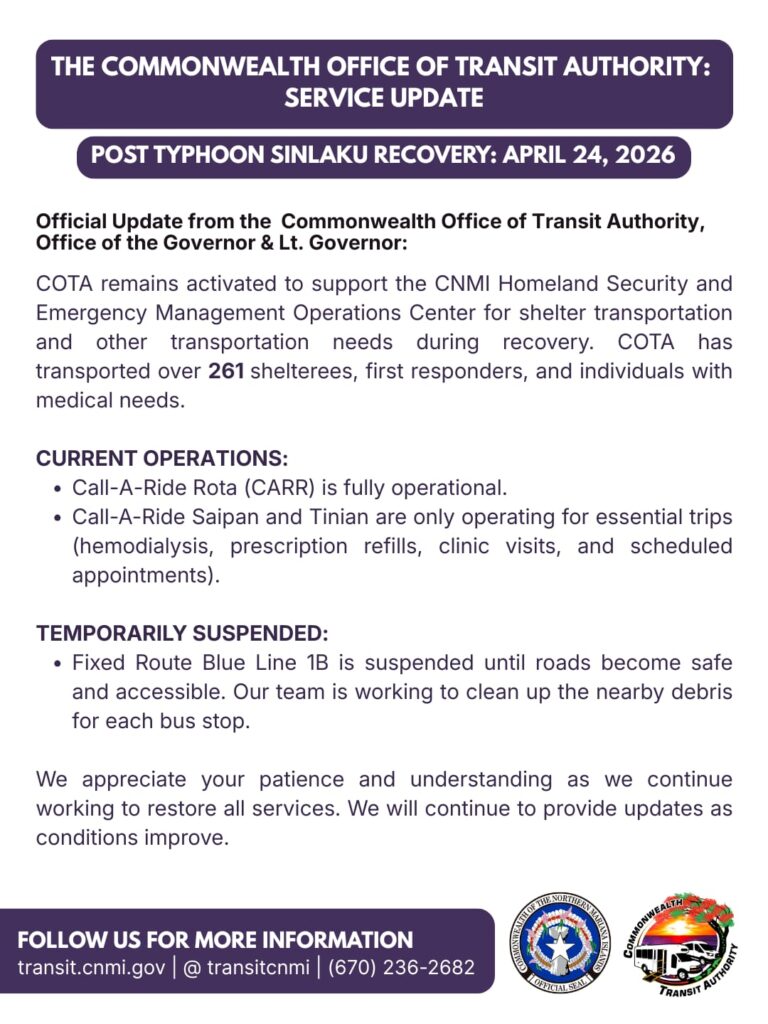 COTA remains activated in support of the CNMI Homeland Security and Emergency Management Operations Center for shelter transportation and other recovery transportation needs.