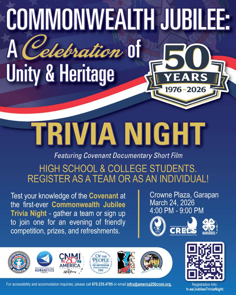 The day concludes with Commonwealth Jubilee Trivia Night at the Crowne Plaza in Garapan from 4 p.m. to 9 p.m. The event, open to high school and college students, invites participants to register as a team or as an individual to compete for prizes while testing their knowledge of the Covenant. A documentary short film will also be screened as part of the evening program.