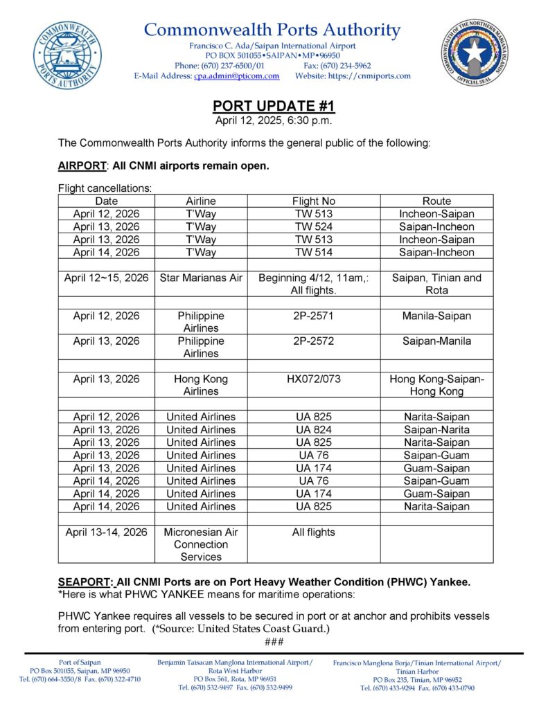 T’Way Airlines canceled four flights between Incheon and Saipan spanning April 12 through April 14. Star Marianas Air suspended all flights between Saipan, Tinian and Rota beginning at 11 a.m. Sunday through April 15. Philippine Airlines canceled its Manila-Saipan and Saipan-Manila flights April 12 and 13. Hong Kong Airlines canceled its Hong Kong-Saipan-Hong Kong service April 13. United Airlines canceled multiple flights including Narita-Saipan and Saipan-Narita routes April 12 through 14, as well as Saipan-Guam and Guam-Saipan service April 13 and 14. Micronesian Air Connection Services canceled all flights April 13 and 14.