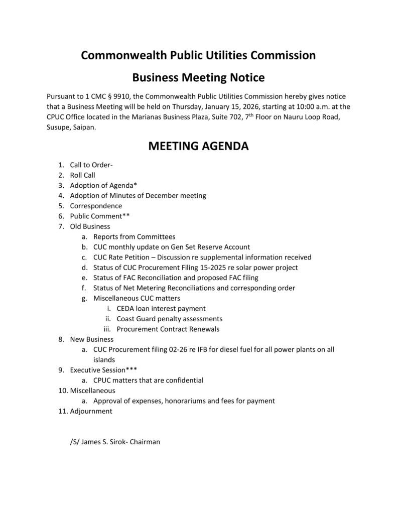 The Commonwealth Public Utilities Commission will meet this Thursday, January 15 at 10 a.m. at its Susupe office in the Marianas Business Plaza. The agenda includes a CUC rate petition update, FAC reconciliation, net metering, a solar procurement filing update, and a new item on diesel fuel bids for power plants across all islands.