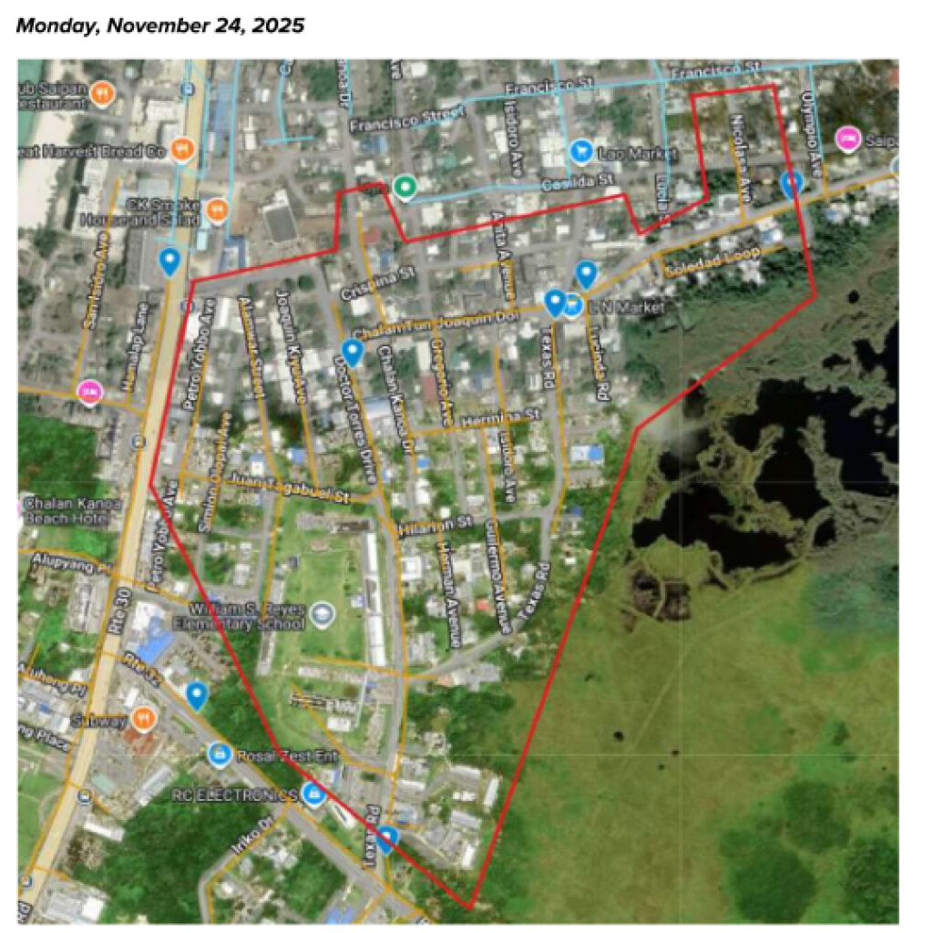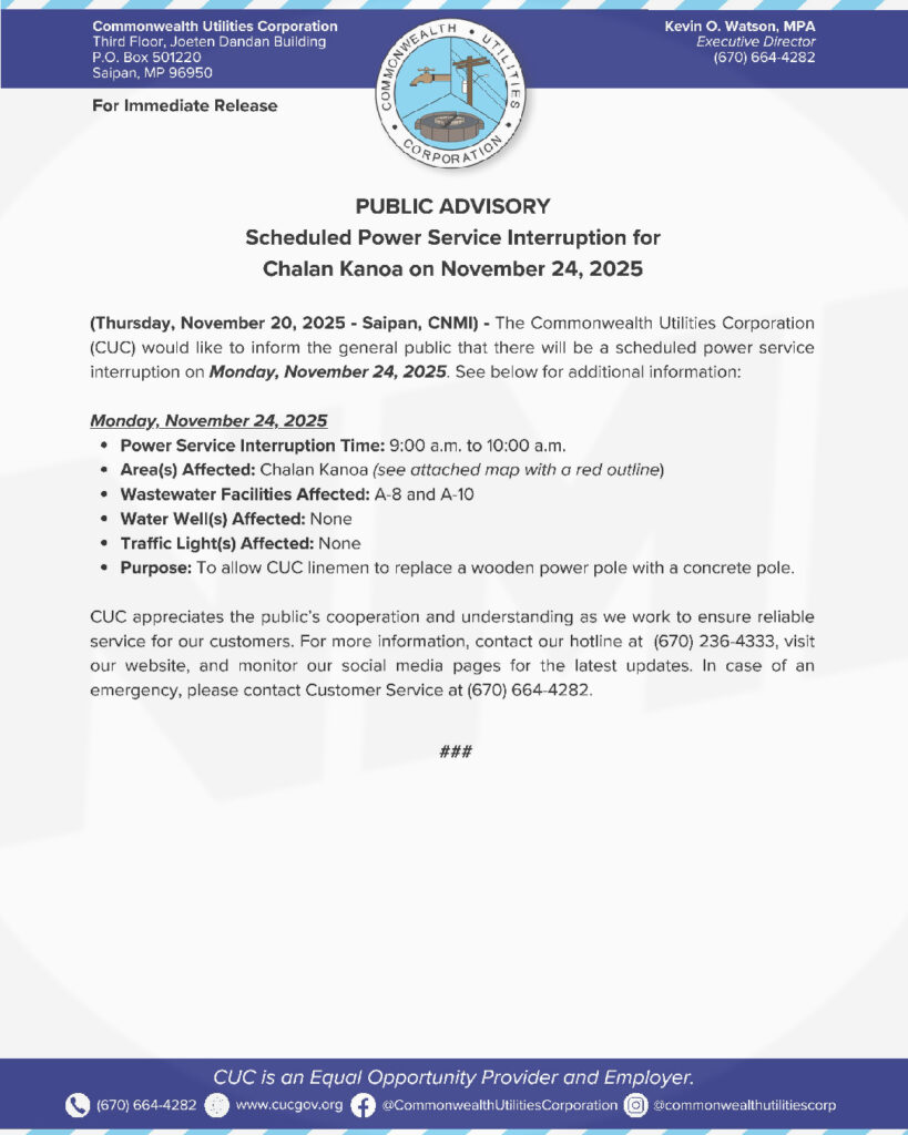 CUC said the outage will run from 9:00 a.m. to 10:00 a.m. and will affect customers within the Chalan Kanoa area outlined in an attached map. Wastewater facilities A-8 and A-10 will be impacted, while no water wells or traffic lights are expected to be affected.