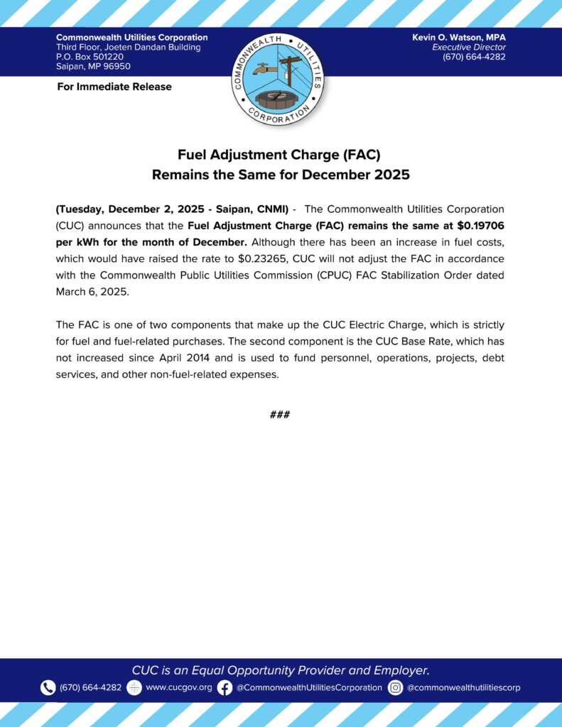 SAIPAN — While the price of just about everything else in the Marianas is on the rise, the Commonwealth Utilities Corporation announced that its Fuel Adjustment Charge (FAC) will remain at $0.19706 per kWh for December 2025, holding steady despite higher fuel costs.