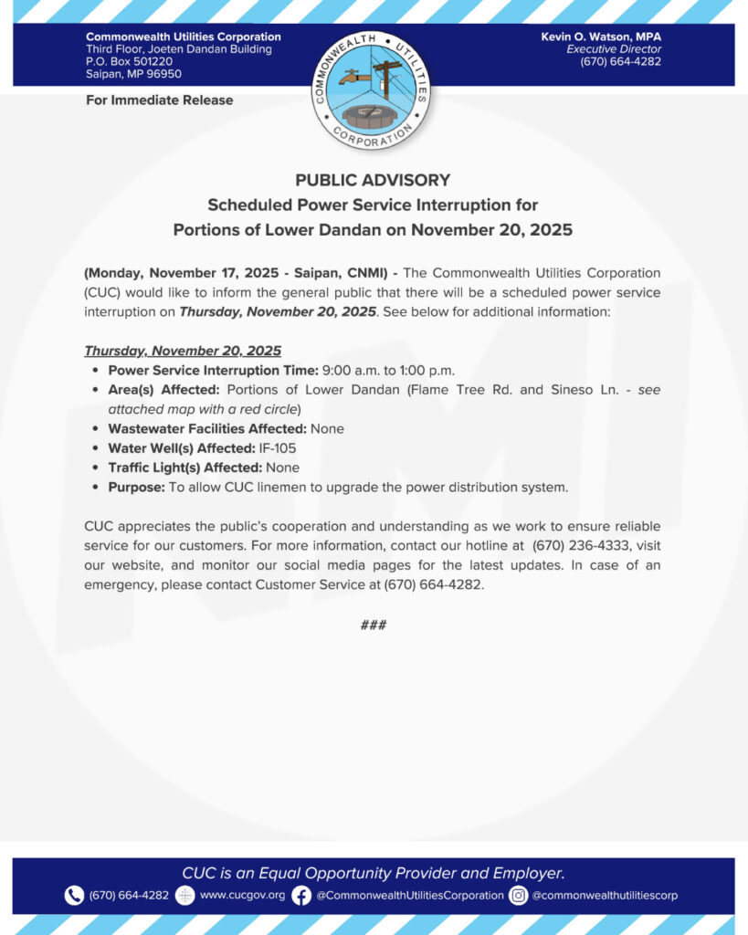 SAIPAN — The Commonwealth Utilities Corporation has announced a scheduled power service interruption for portions of Lower Dandan on Thursday, November 20, 2025, from 9:00 a.m. to 1:00 p.m.