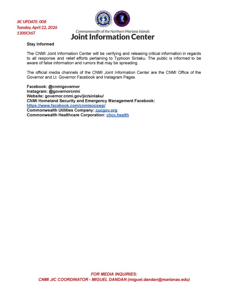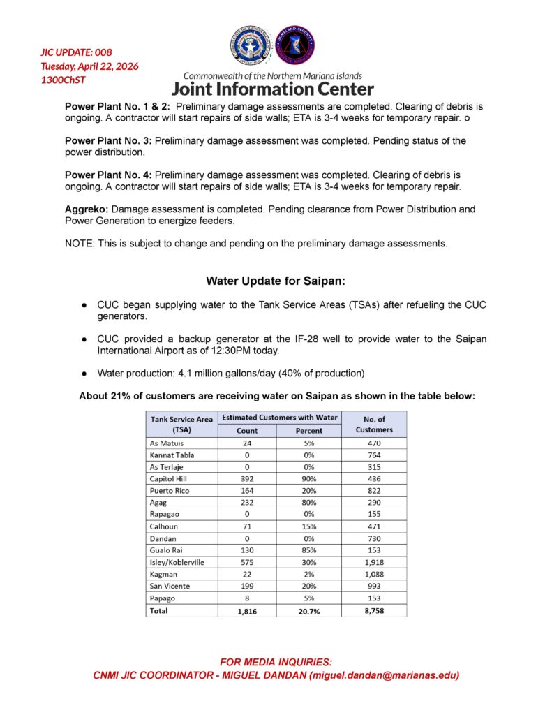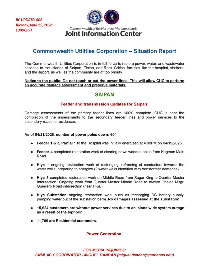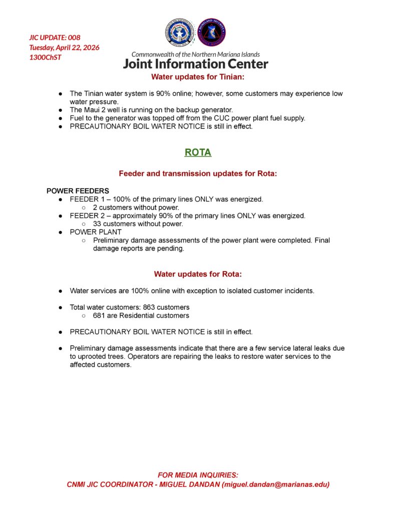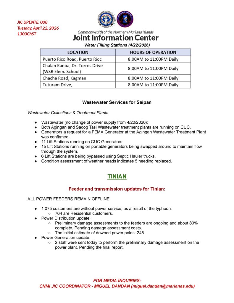 On Tinian, all power feeders remain offline. Damage assessments to feeders are about 80 percent complete with an initial estimate of 245 downed poles. A two-person crew was dispatched Tuesday to assess the power plant. A total of 1,075 customers are without power, including 764 residential customers. The Tinian water system is 90 percent online, with some customers experiencing low pressure. The boil water notice remains in effect.
