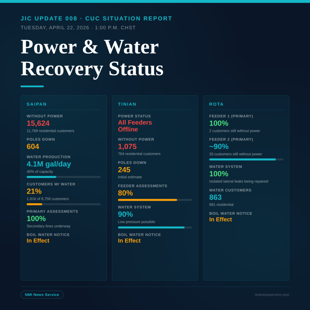 CUC: Primary Feeder Assessments Complete, 21% of Saipan Has Water, Tinian Still Dark