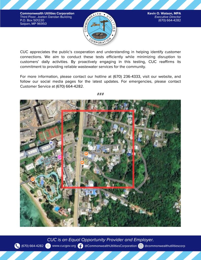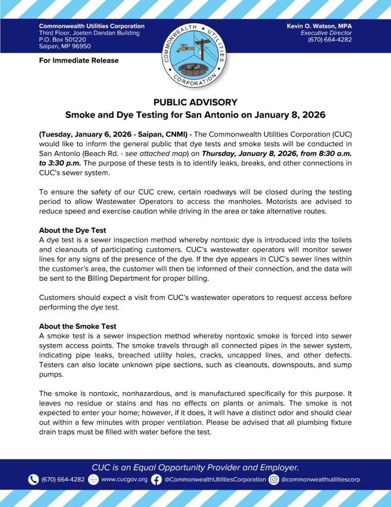 SAIPAN — The Commonwealth Utilities Corporation will conduct smoke and dye testing in San Antonio (Beach Road area) on Thursday, January 8, from 8:30 a.m. to 3:30 p.m., as crews work to identify leaks, breaks, and other connections in CUC’s sewer system. Some roadways will be closed during the testing period so wastewater operators can access manholes. Motorists are advised to slow down, use caution, or take alternative routes.