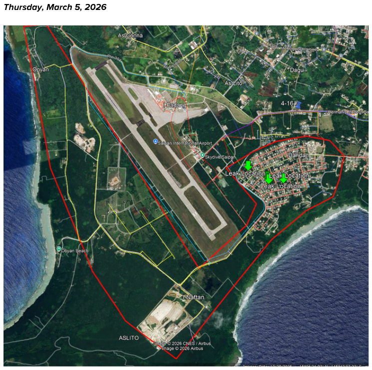 SAIPAN — The Commonwealth Utilities Corporation has scheduled a water service interruption for the communities of Dandan, Naftan, and Obyan on Thursday, March 5, from 8:30 a.m. to 4:30 p.m. to allow crews to repair four service lateral leaks.