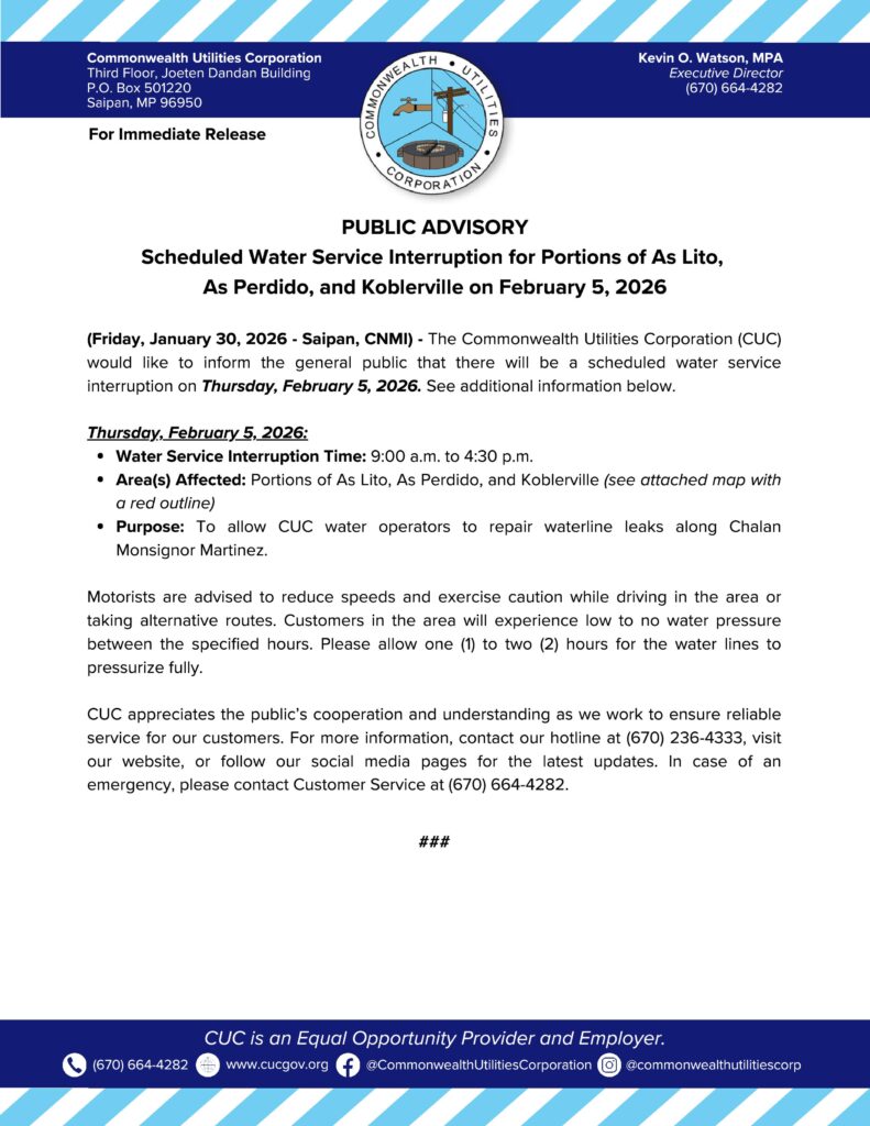 SAIPAN — The Commonwealth Utilities Corporation has announced a scheduled water service interruption for portions of As Lito, As Perdido and Koblerville on Thursday, February 5, from 9 a.m. to 4:30 p.m.
